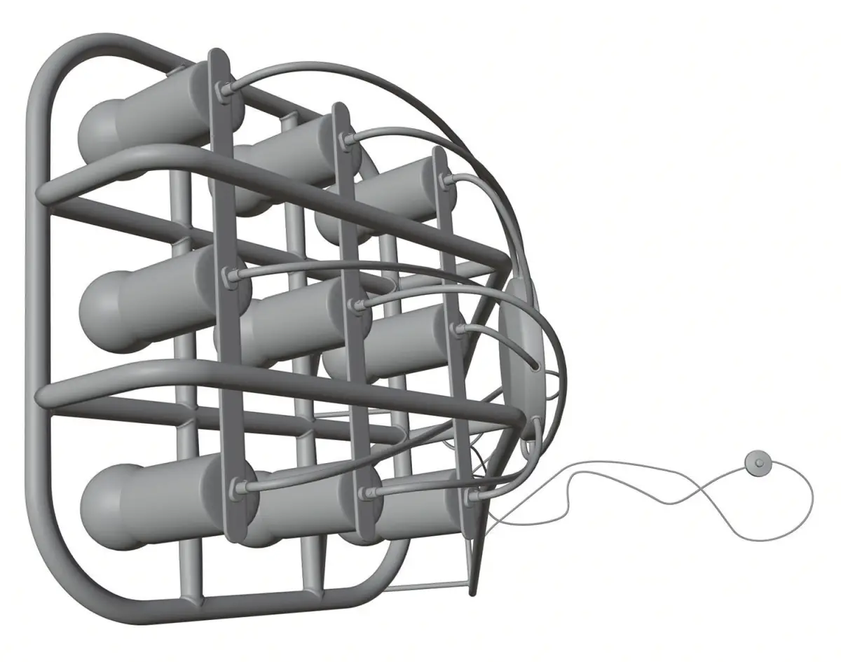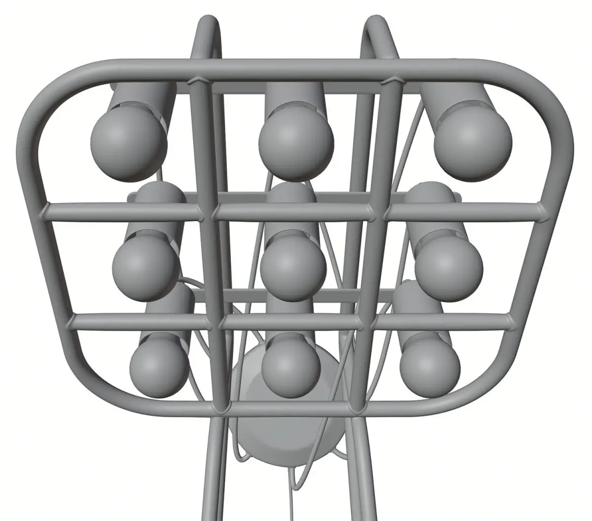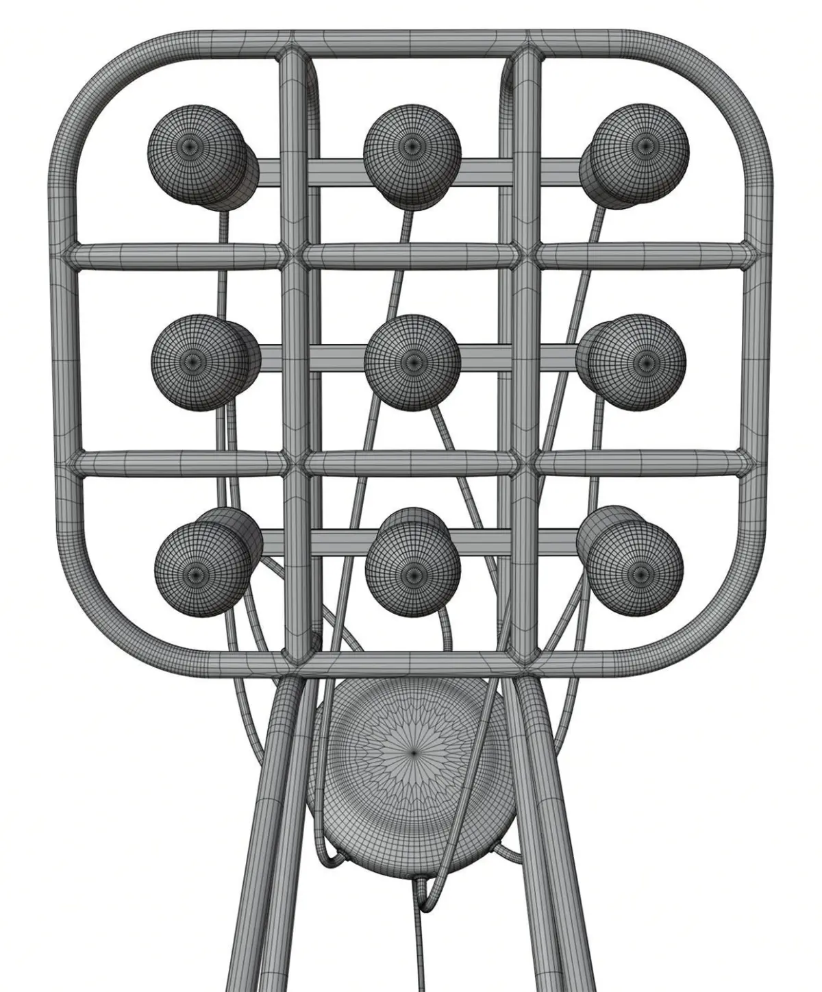 This realistic 3D model presents the modern standing lamp. On high legs placed a frame made of small squares, each of them has a separately mounted light bulb. Model prepared for 3d architectural visualisations and other graphic works.