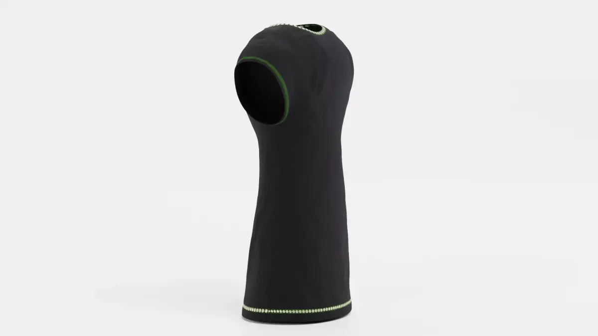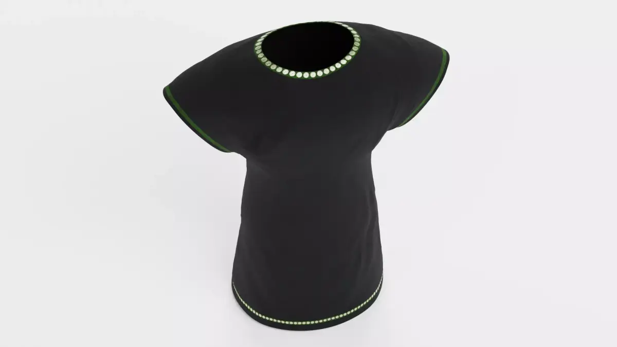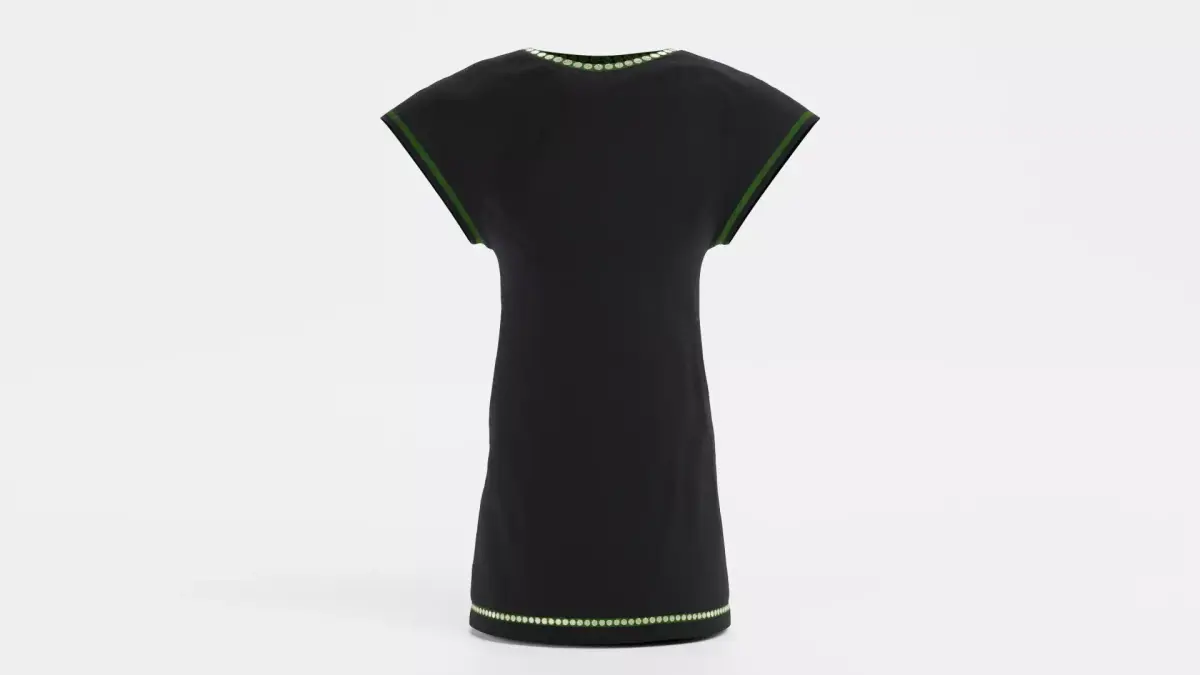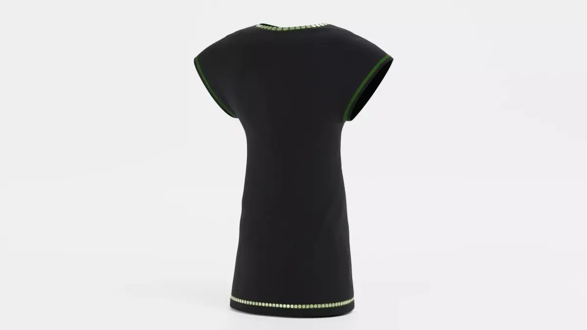 A realistic 3D model of a black tunic-style dress featuring subtle decorative trims. The dress includes gold detailing around the neckline and hem, with green edging along the sleeves. Natural fabric folds and a well-proportioned silhouette give the model a wearable appearance, while the high-quality materials ensure consistent shading and realistic cloth behavior.