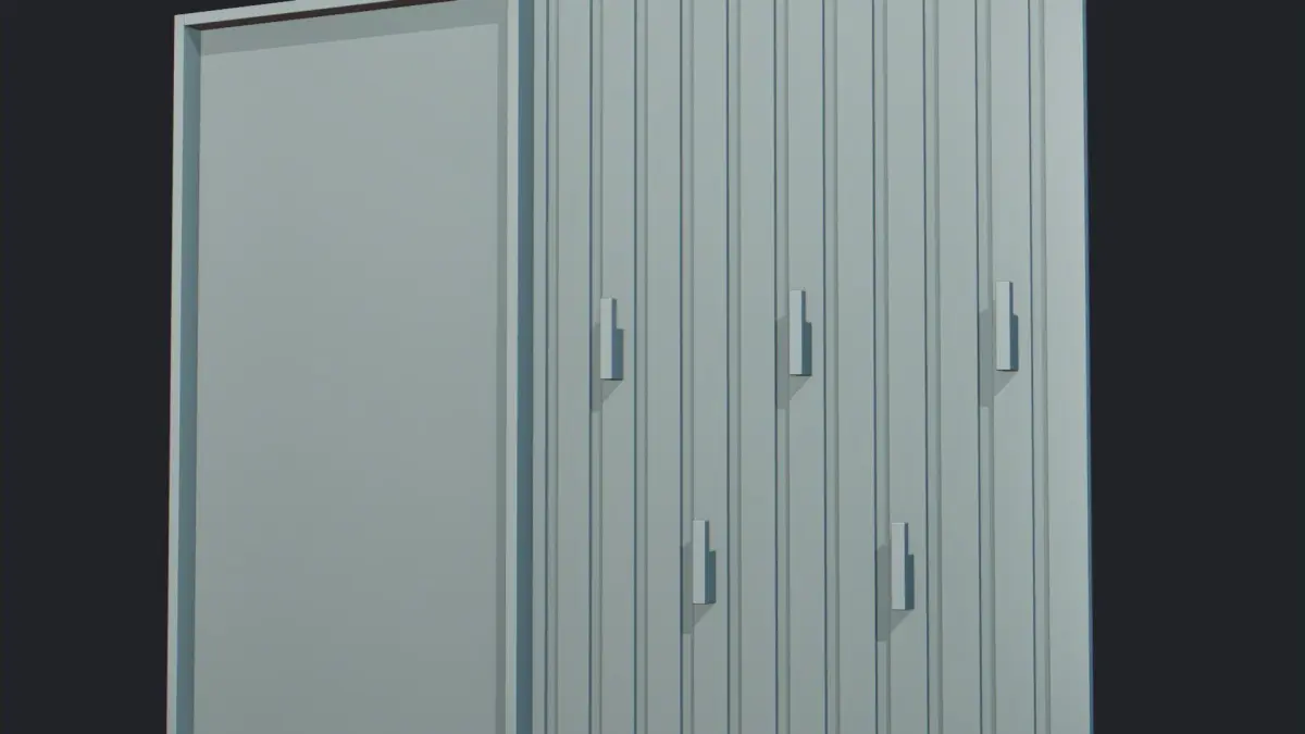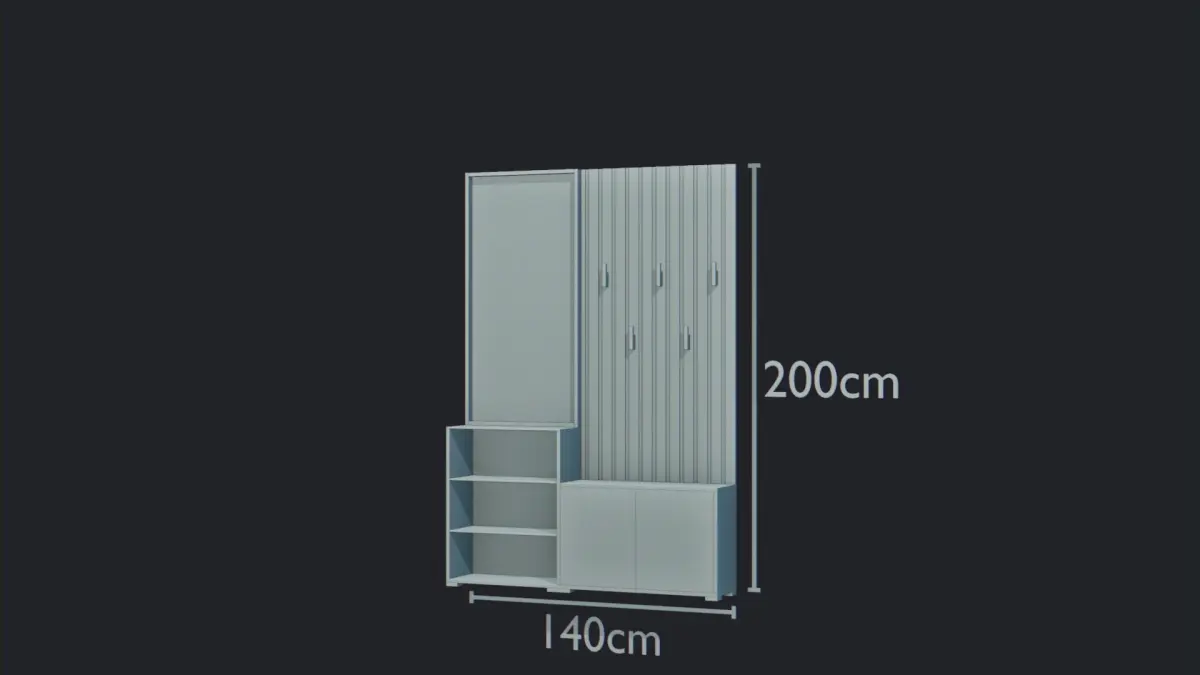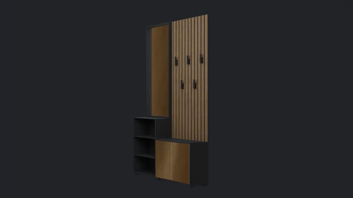A shoe rack with black color and vertical strip wood. On the left side it has 3 racks and on the right side it has 1 rack with mirror door so that people can look for their shoe while using it.