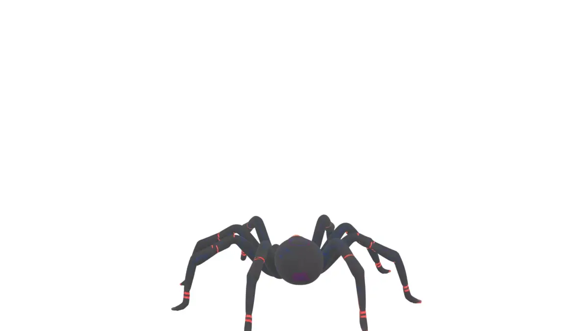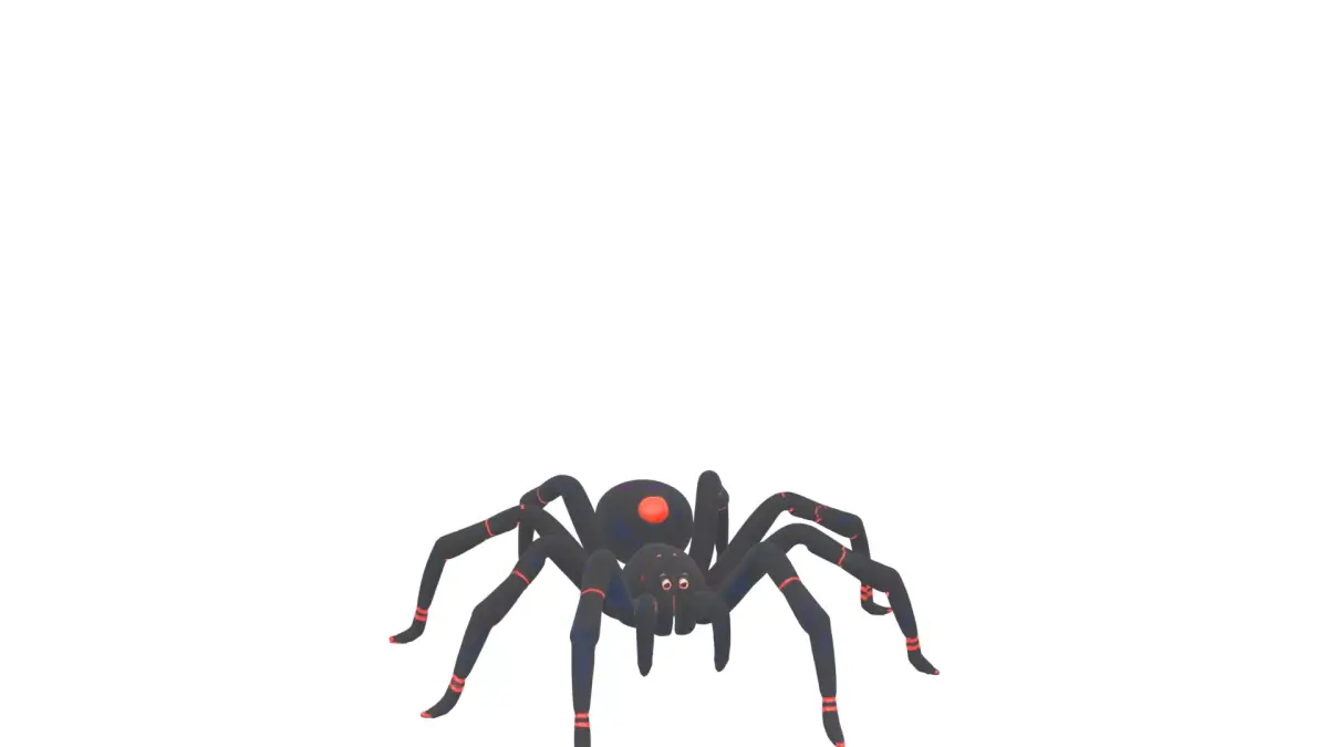 Create a black widow spider prop with jointed articulated legs, iconic red hourglass marking, and detailed web spinneret. Features a plush textured body with glossy reflective eyes. Provide four orthographic views on white background: front view displaying full leg span, back view highlighting spinneret, left side body profile, and right side emphasizing the hourglass mark. Ideal for game assets and cartoon animations featuring creepy crawlies.