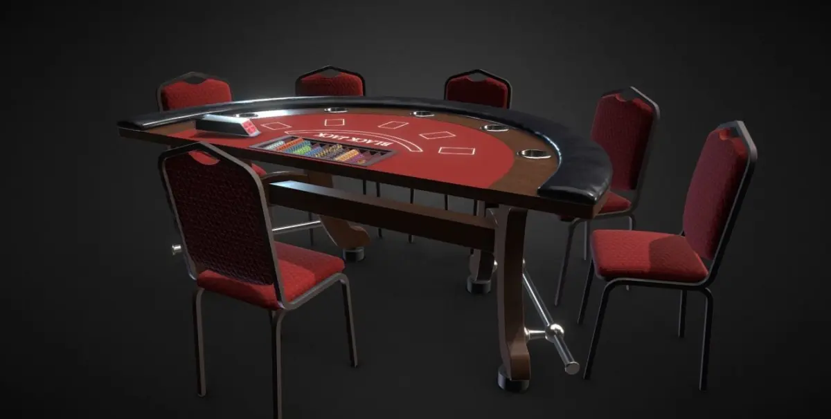 A blackjack table is a complex and elaborate piece of furniture, with six chairs and chips.