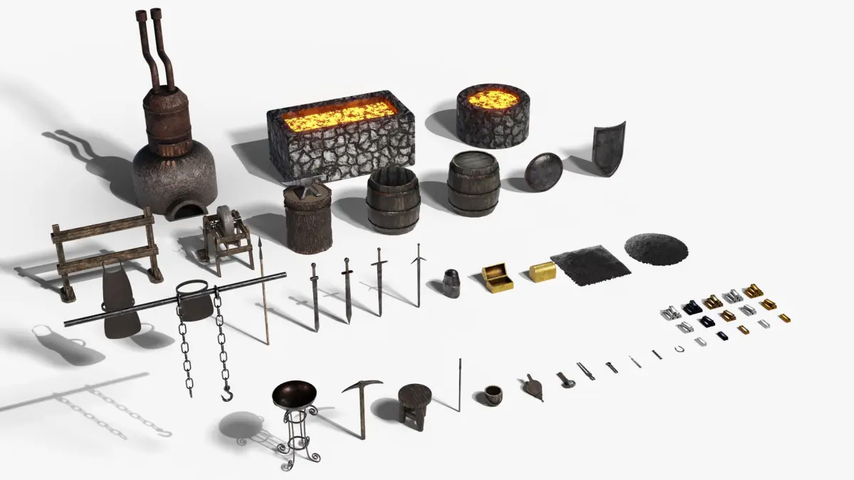This Blacksmith Asset Pack includes over 25 handcrafted 3D models designed for use in fantasy, medieval, or RPG-style games.