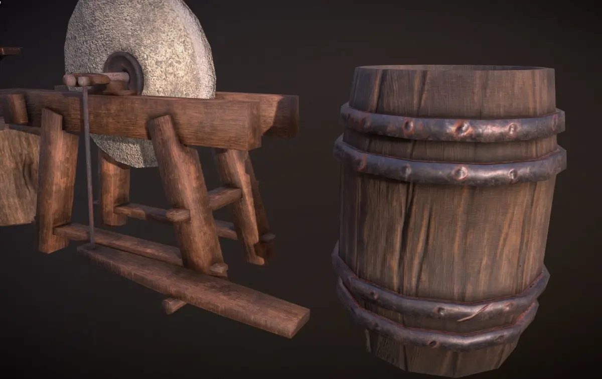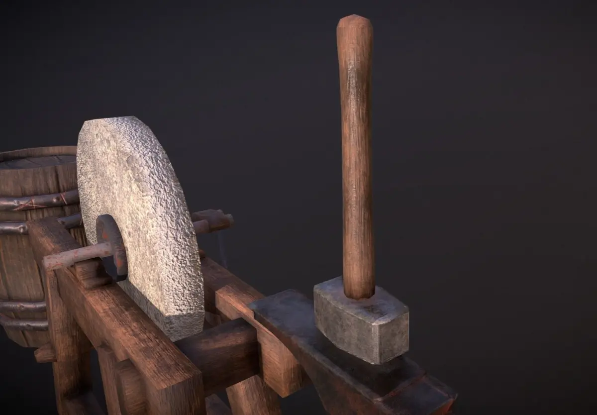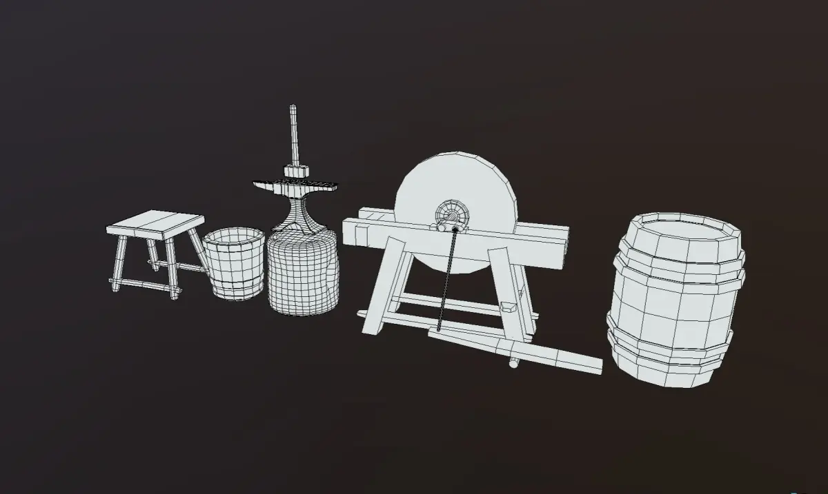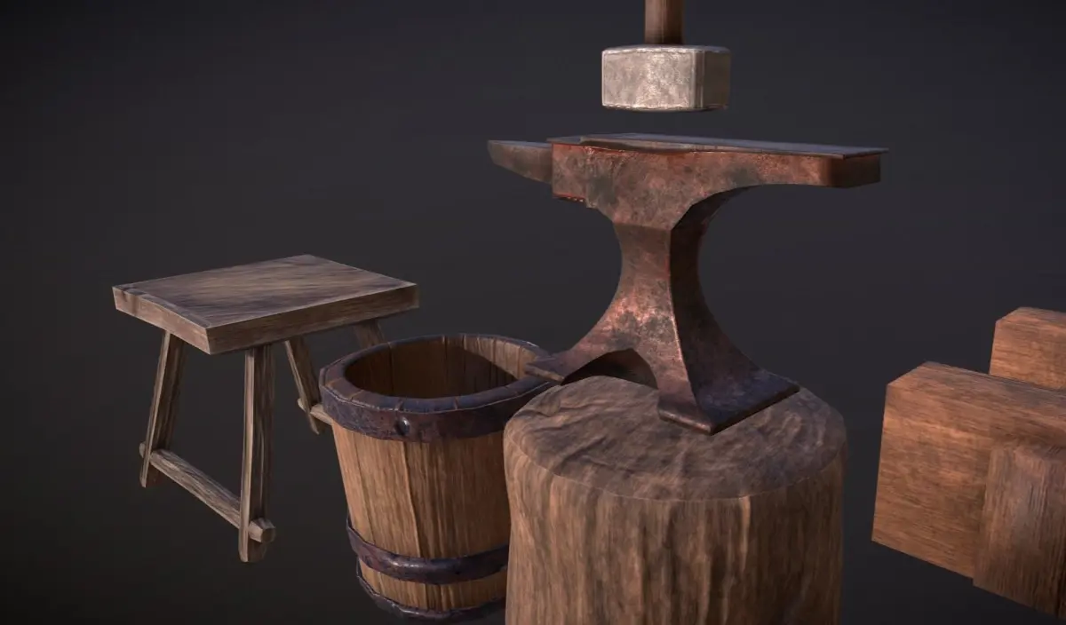 Includes 7 models (grindstone, anvil, hammer, stump, barrel, bucket, stool) with uv maps, good topology and textures.Most models have their own 2k textures (can be lowered). Low poly. Can be used as game assets or for whatever you see fit.