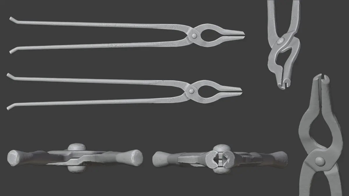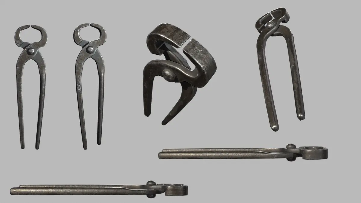 File contains 3 models of blacksmith tongs (mb, fbx, obj, blend, spp)UV - 1x4069Textures - base color, normal, AO, metallic, roughnessPliers_1 - 1994 tris, 978 vertsPliers_2 - 796 tris, 404 vertsPliers_3 - 1528 tris, 770 verts