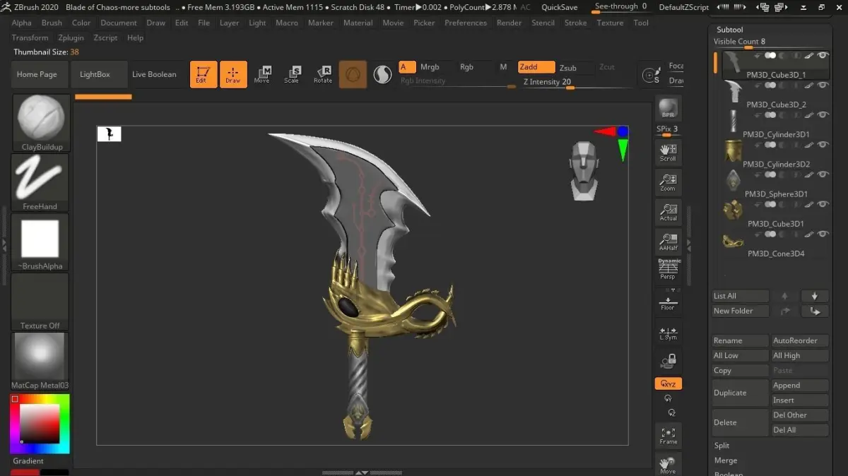 This contains two .ZPR files (ZBrush Project ), one with one blade with multiple subtools, and second one with with all those subtools merged and therer are two blades This is High-poly mesh it has no textures but as you can see it has colours and materials (materials are all official)