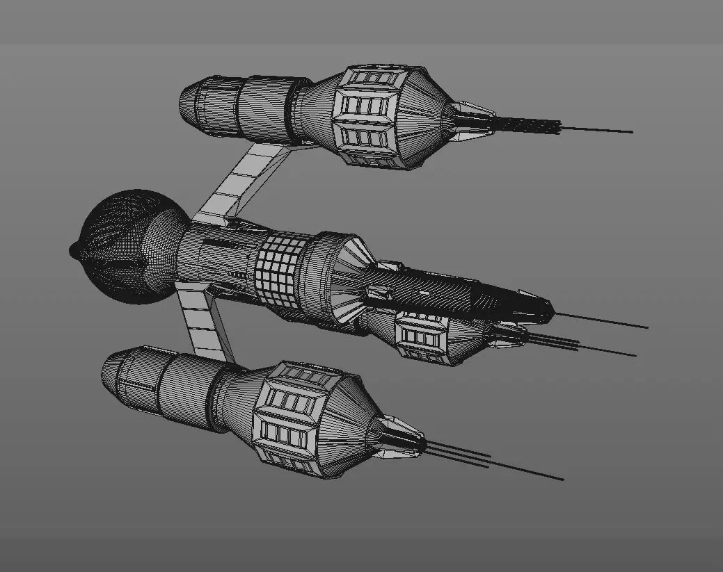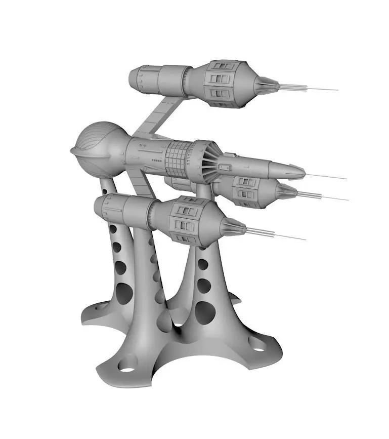 The Liberator from the TV series Blakes 7. Model has been split up for ease of printing and assembly. Printed pins keep parts properly aligned during assembly. Small gauge wire is needed for the antannae (0.6mm diameter, 1 piece 38mm long, 3 pieces 55mm long, and 18 pieces 27mm long). Please note that included stand will take a long time to print.