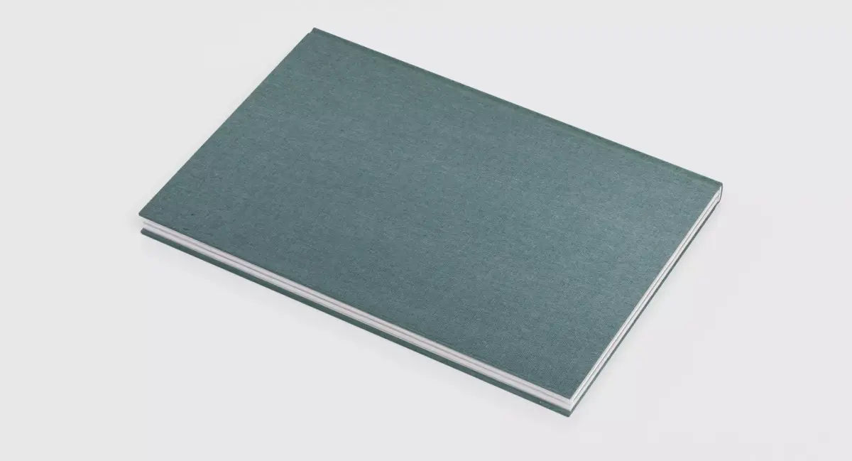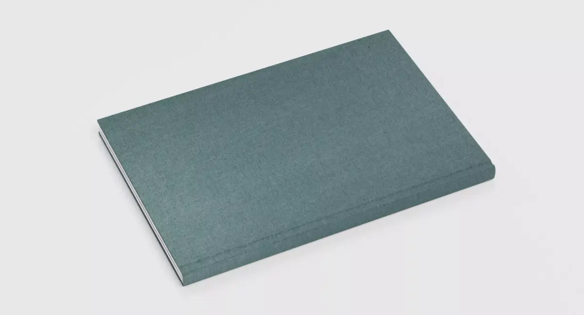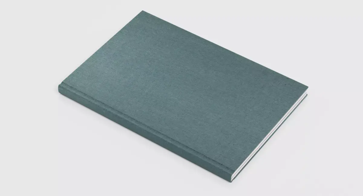 A realistic closed bound publication with dark green, textile-style hardcover boards and a naturally softened spine. The cover shows subtle folds and material tension around the binding. The visible page block features white paper with mild signs of handling, adding believable visual. This asset is easy to place into a wide range of interior scenes, from studies and libraries to contemporary or narrative-focused environments.