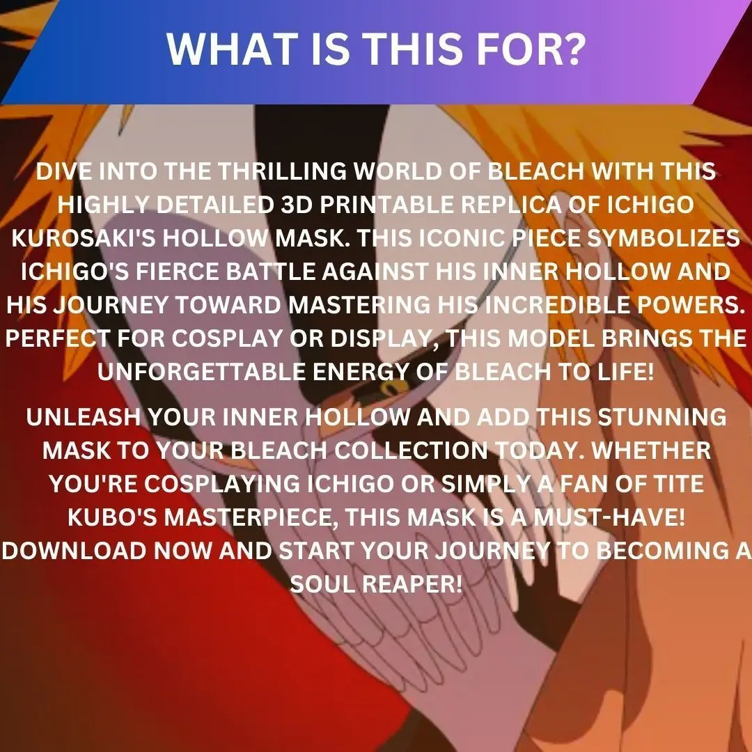 Dive into the thrilling world of Bleach with this highly detailed 3D printable replica of Ichigo Kurosaki's Hollow Mask. This iconic piece symbolizes Ichigo's fierce battle against his inner Hollow and his journey toward mastering his incredible powers. Perfect for cosplay or display, this model brings the unforgettable energy of Bleach to life!