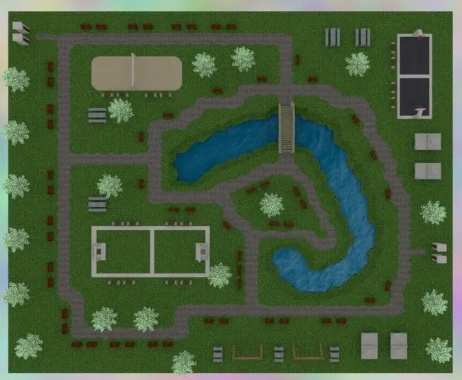 1) X3 Different bench2) X2 Different Picnic table with bench3) Tennis table's4) Toilets5) Swings6) Bridge7) Tree's8) River9) Basketball playground10) volleyball playground11) Futbooll playground12) All textures - Over 15 different textures.
