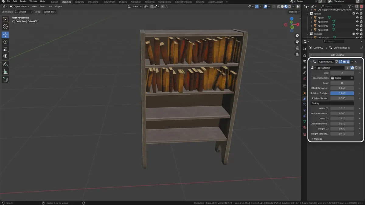 Book Stacker: Arrange books efficiently on virtual shelves, setting physical dimensions with added randomness for a natural look. Seed functionality provides limitless variations for richly detailed library interiors.