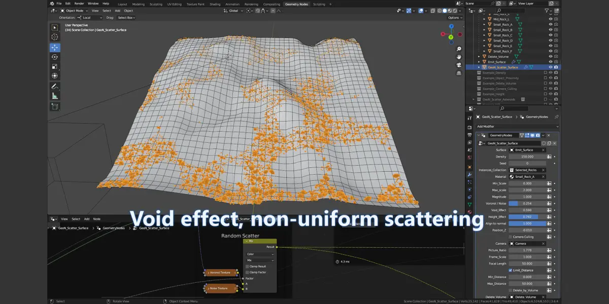 A Blender scene with a geometry node setup to scatter instances on ground 3D space. I have been using these rocks assets many times for my personnal projects and pictures. Tweak it at will!. The scene was built with Blender 3.6.4. It will work with Blender 3.6 LTS and further 4.x versions. It might work with previous versions but it might get hasardous results.