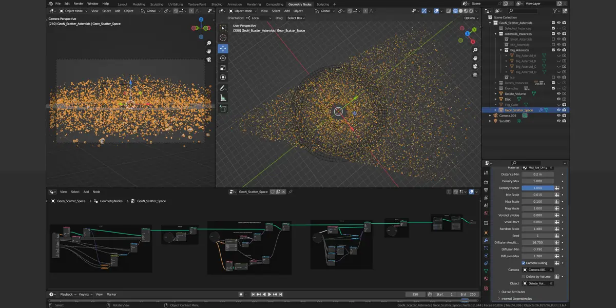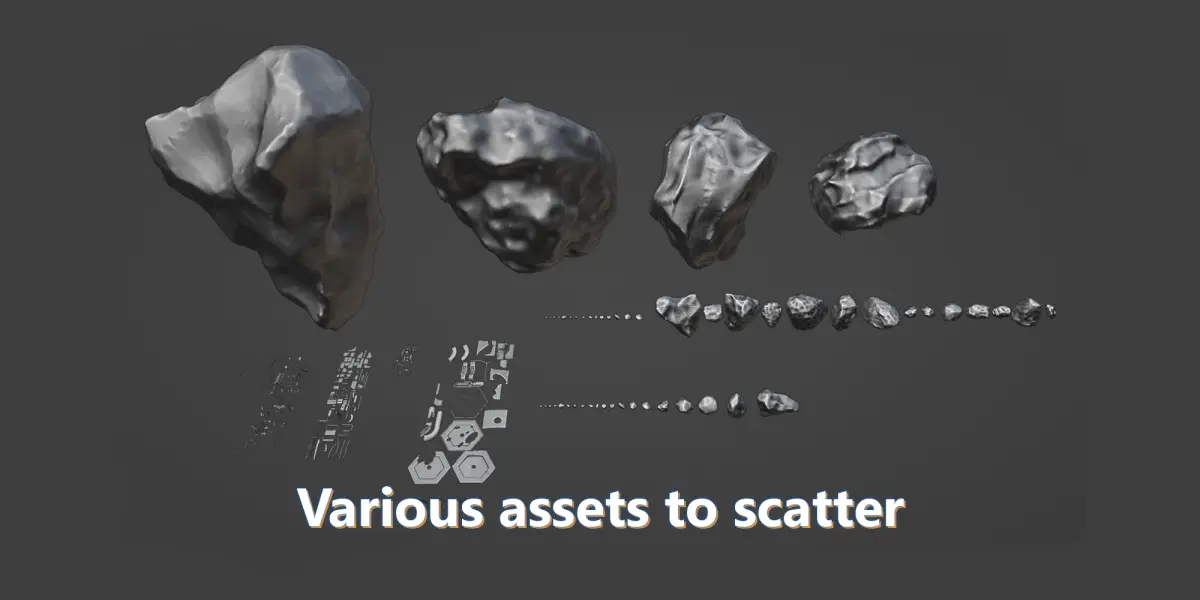 A Blender scene with a geometry node setup to scatter instances in a 3D space. I have been using these rocks and debris assets many times for my personnal projects and sci-fi pictures. Tweak it at will!. The scene was built with Blender 3.6.4. It will work with Blender 3.6 LTS and further 4.x versions. It might work with previous versions but it might get hasardous results.