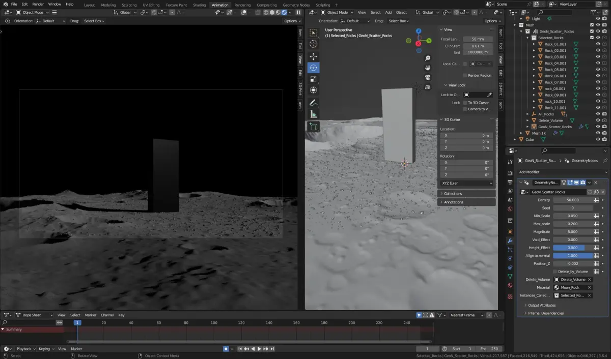 - geometry nodes scattered rocks on the ground, (this is my GeoN_Scatter_Rocks setup)