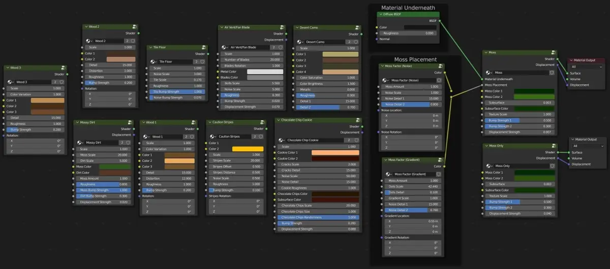 Customizable Node Groups: Each material has been created as a custom node group, with many different customizable values, such as: Scale, Rotation, Color, Metallic, Details, Distortion, Noise Settings, Roughness, Normal and Bump, Displacement, and more!