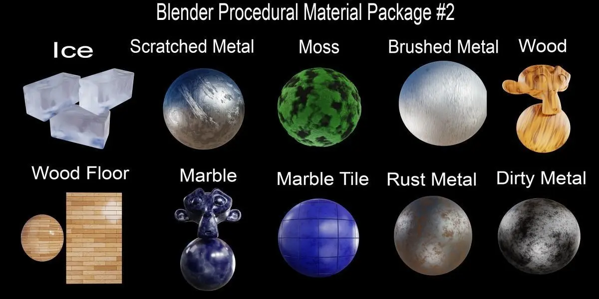 This Blender Procedural Material Package contains 10 realistic Procedural Materials and Models, Design using Blender.
