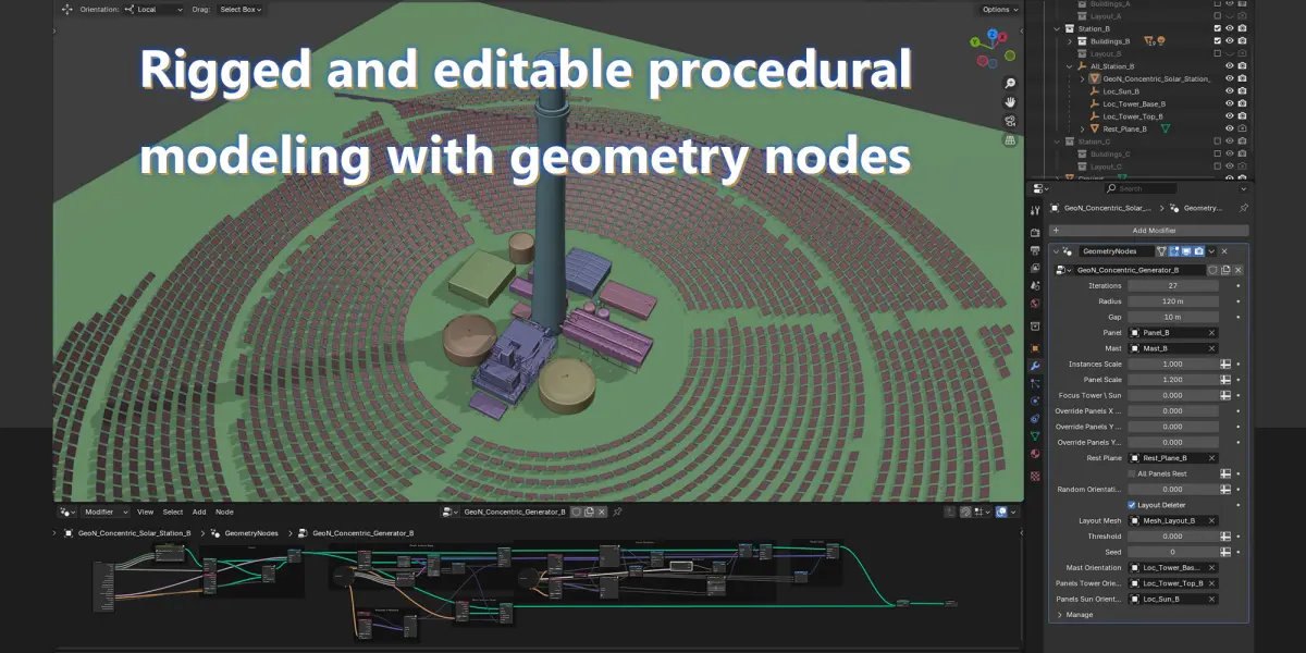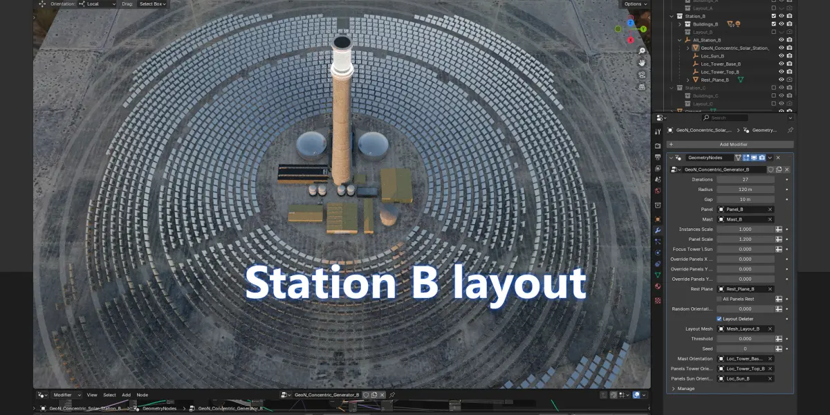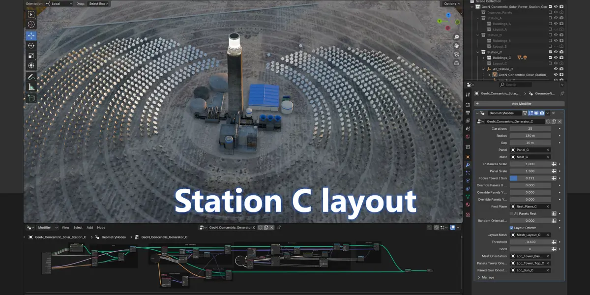 This is a procedural modeling setup, fully editable and rigged geometry nodes, that generates a concentric solar station, or solar power tower. It allows easy construction of any type of concentric solar plant with a comprehensive orientation system for mirror panels. You can define it precisely: radius, space between panels, number of circles, then by deleting unnecessary points to give the whole a general given shape called layout. The scene also includes various assets, maps and shaders.