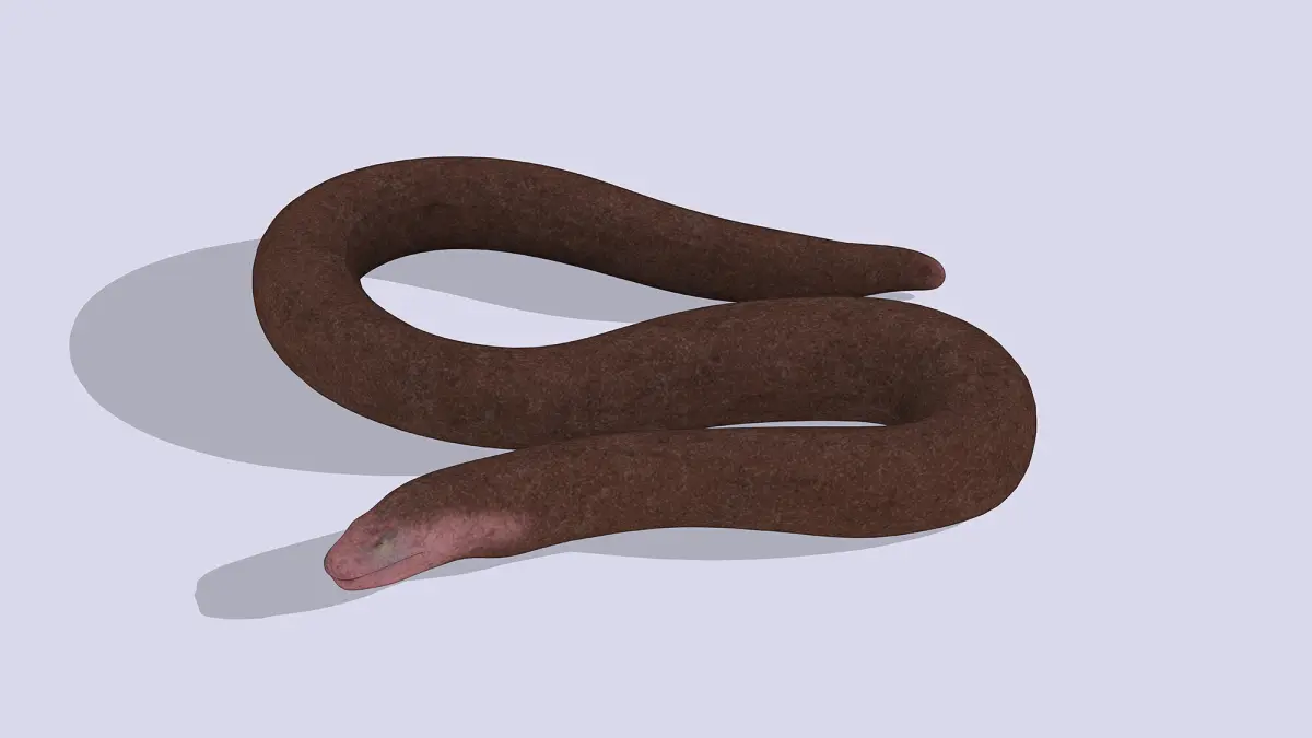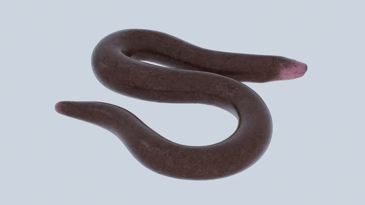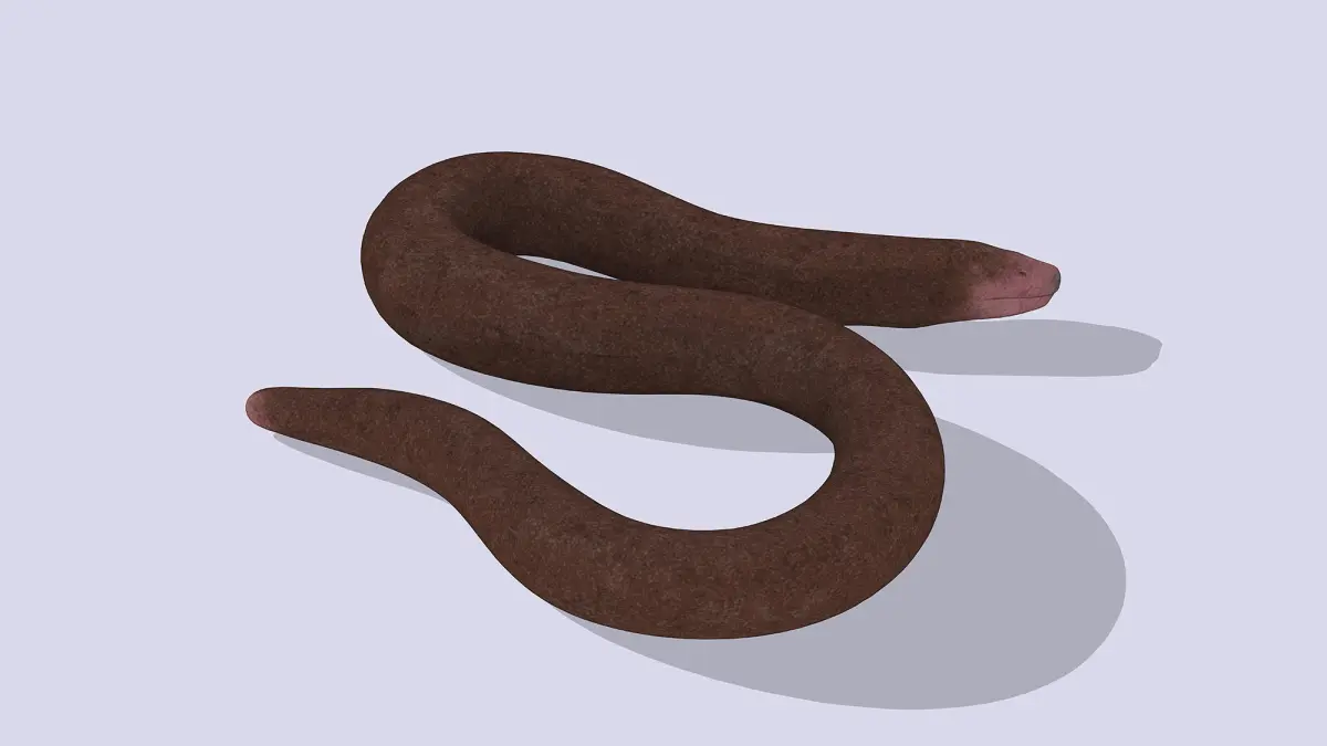 This 3D low-poly model represents a blind snake, crafted with a smooth, dark brown body and a subtle pinkish head. The minimalist design captures its elongated, legless form and textured surface, ideal for educational tools, game assets, or nature-inspired art. The simplified geometry highlights its unique adaptation to a subterranean lifestyle with a sleek, understated aesthetic.