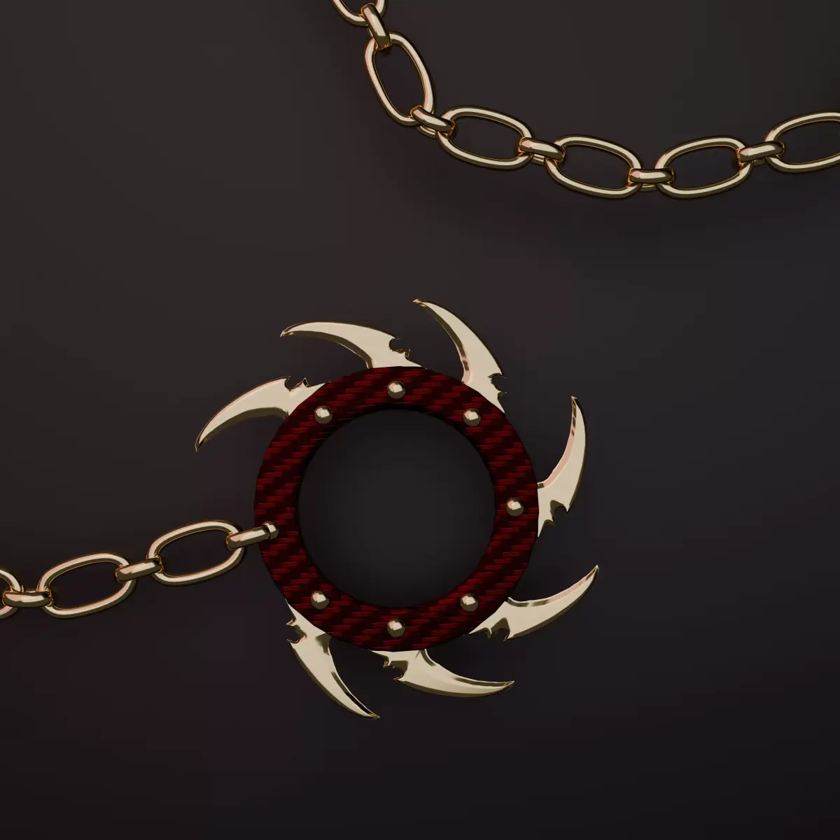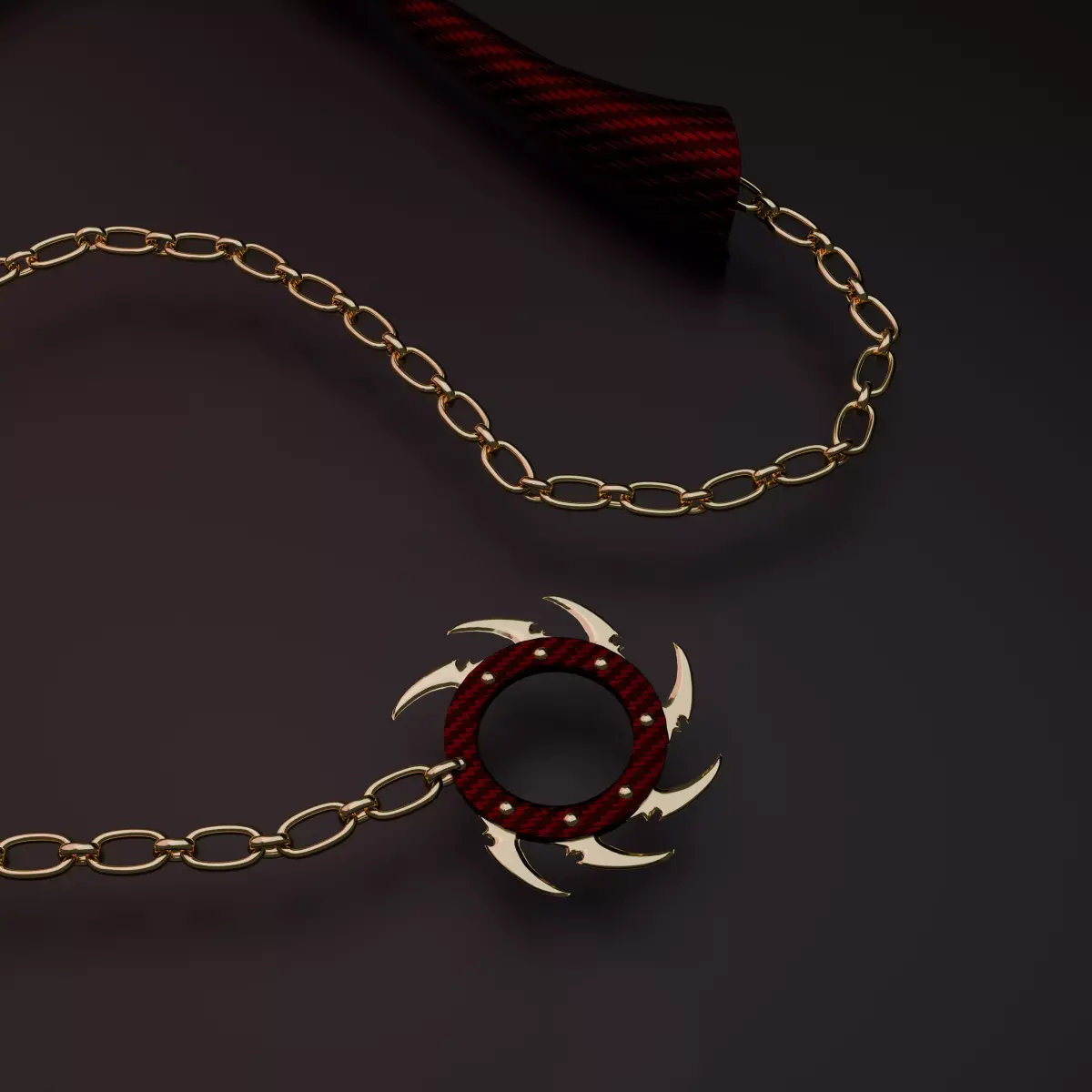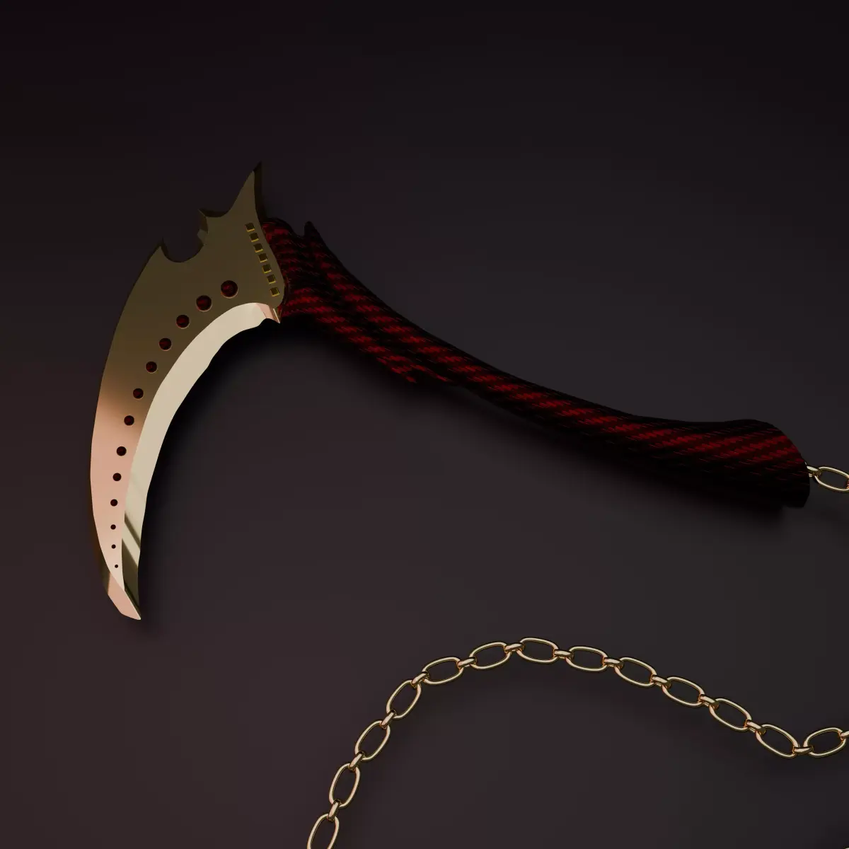 Visual FeaturesIconic Design: Faithful recreation of the curved golden blade and the spiked counterweight ring.Detailed Texturing: Features a distinctive crimson and black woven carbon-fiber style handle that contrasts beautifully with the metallic gold elements.Dynamic Chain: Intricately modeled chain links connecting the sickle (kama) to the weight, designed for dynamic posing.