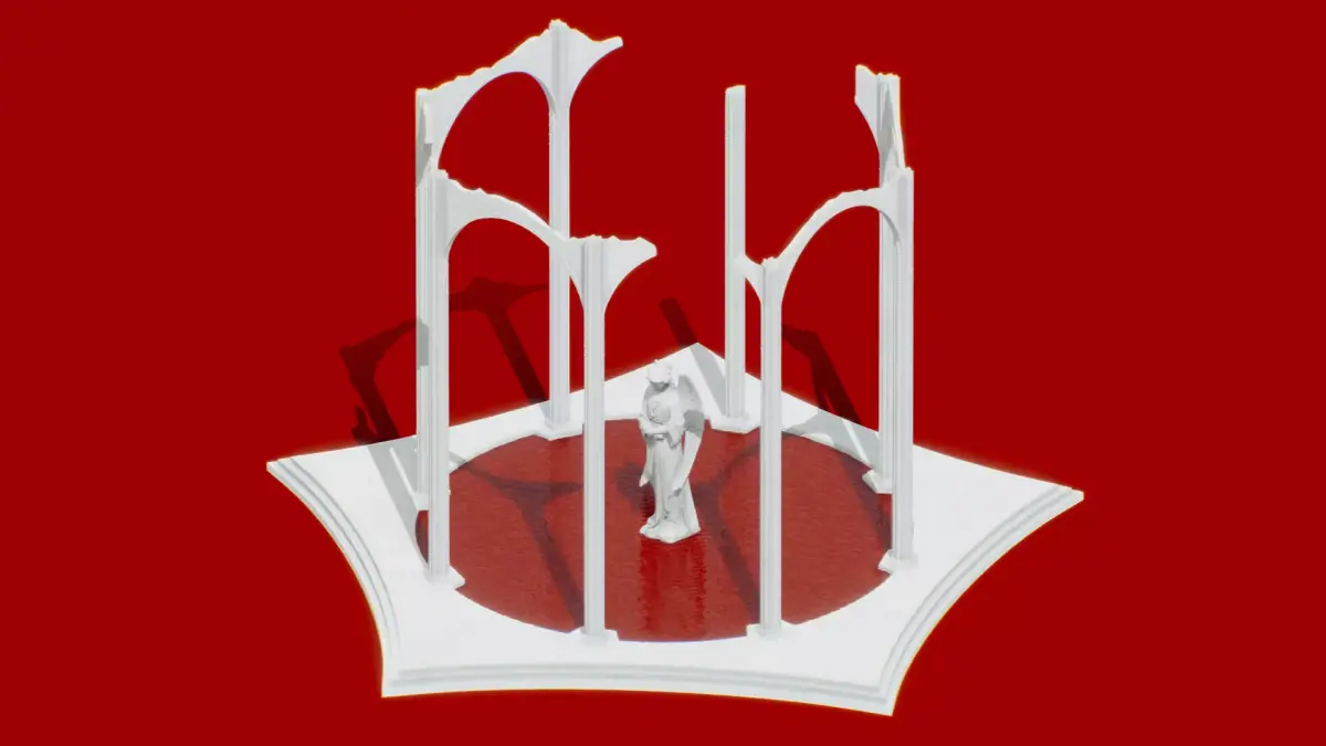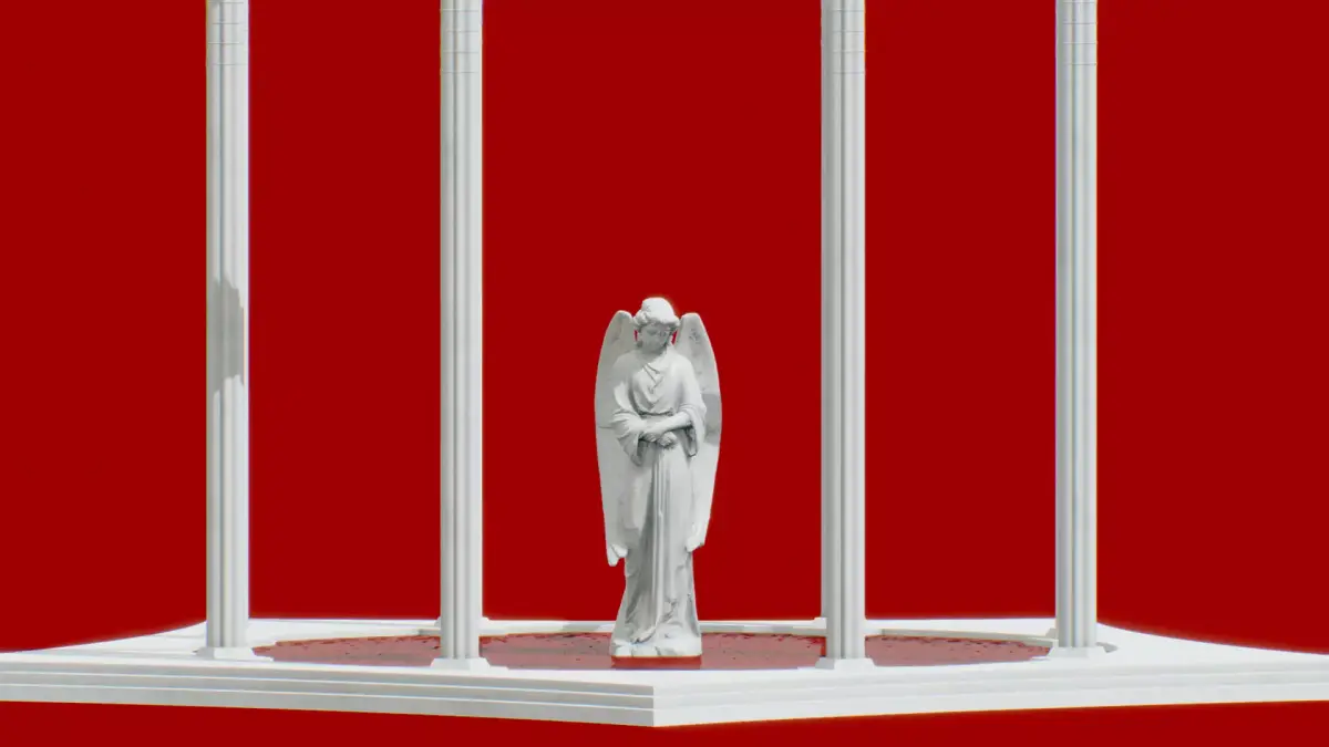 Classical temple made of white marble with pool of blood and statue in the middle.
