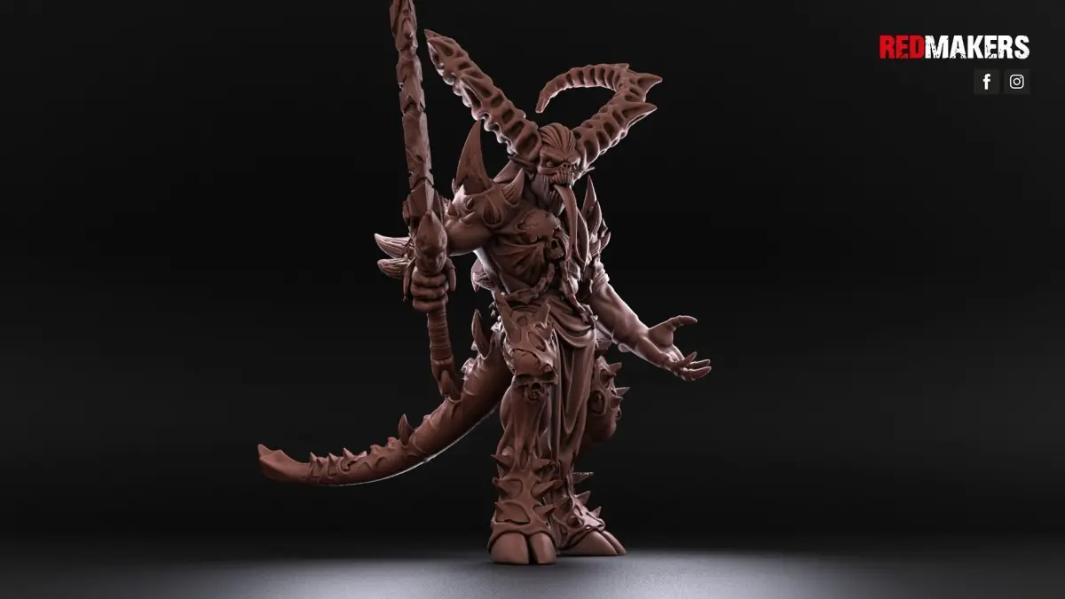 The Bloodthirsty Master is made for a 28mm scale with an actual eye height of 34mm. There is an option with a regular hand and with a victim.