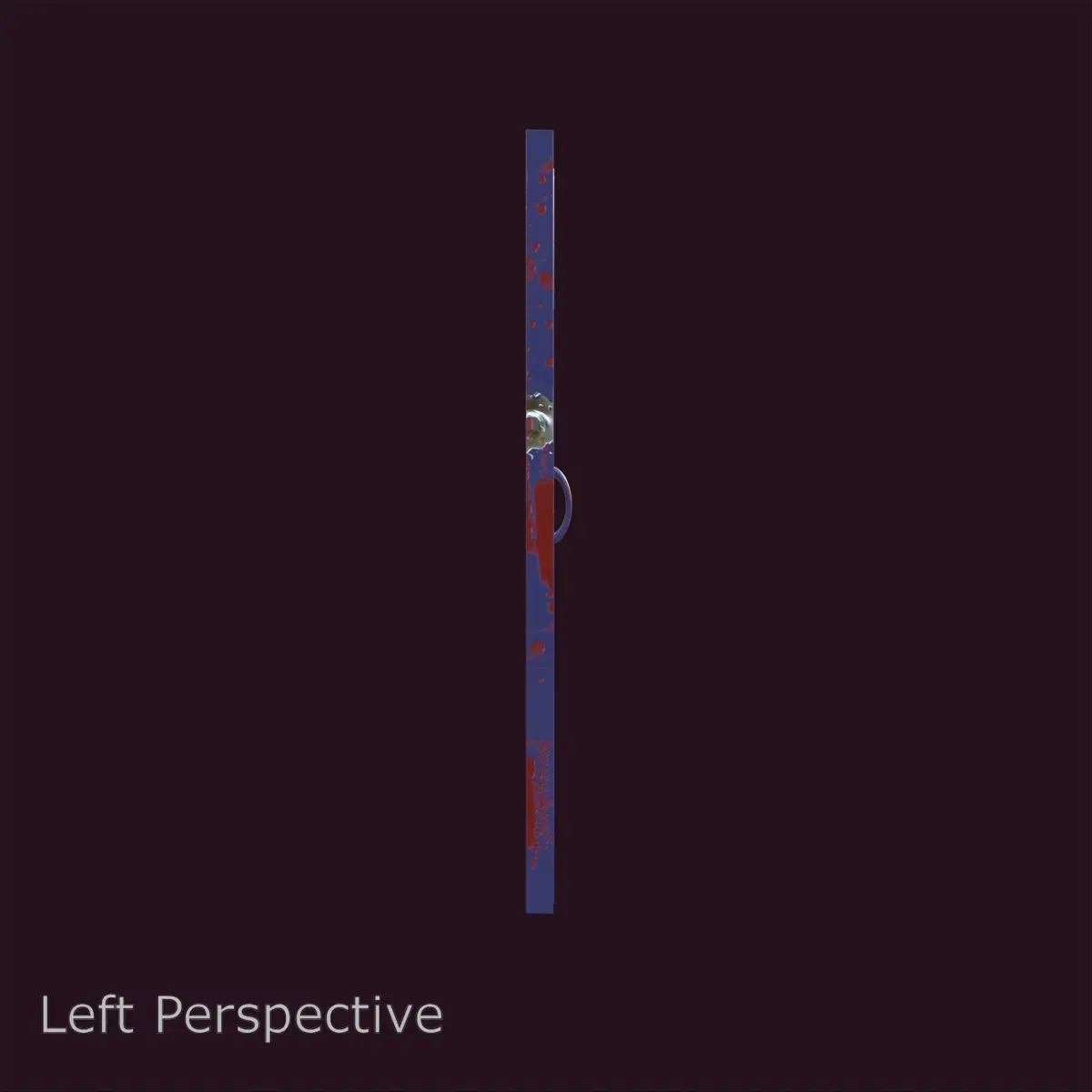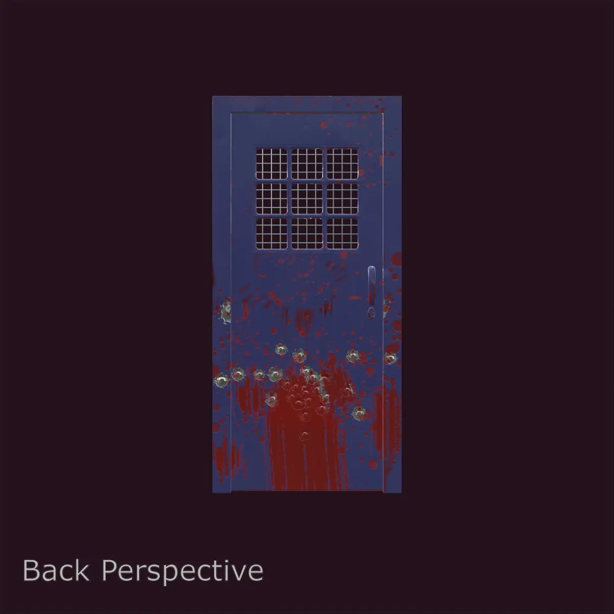 This detailed 3D model features a weathered blue prison door covered in bloody handprints and bullet holes, evoking intense horror or post-apocalyptic vibes. The secure grid window and unsettling damage make it perfect for use in horror games, cinematic environments, or survival scenes. The model includes 2K PBR textures for high realism and visual impact.