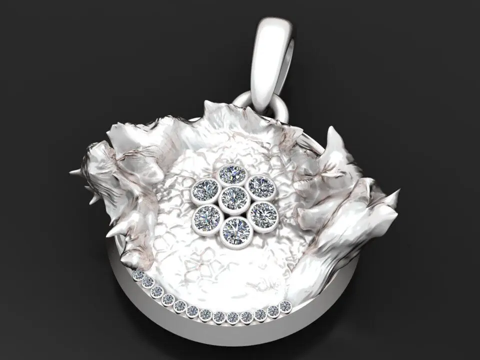 Introducing the Molten Bloom Medallion Pendant — a stunning fusion of organic chaos and refined elegance. This round pendant showcases a unique molten-texture design, as if nature itself shaped the metal. Available in both polished white gold and rich yellow gold, its center features a blooming cluster of six sparkling diamonds, radiating light and luxury. The outer edge is delicately encircled with smaller diamonds, adding a sophisticated finishing touch. A perfect statement piece for those who appreciate avant-garde artistry, natural forms, and timeless luxury.