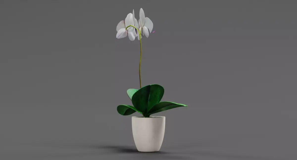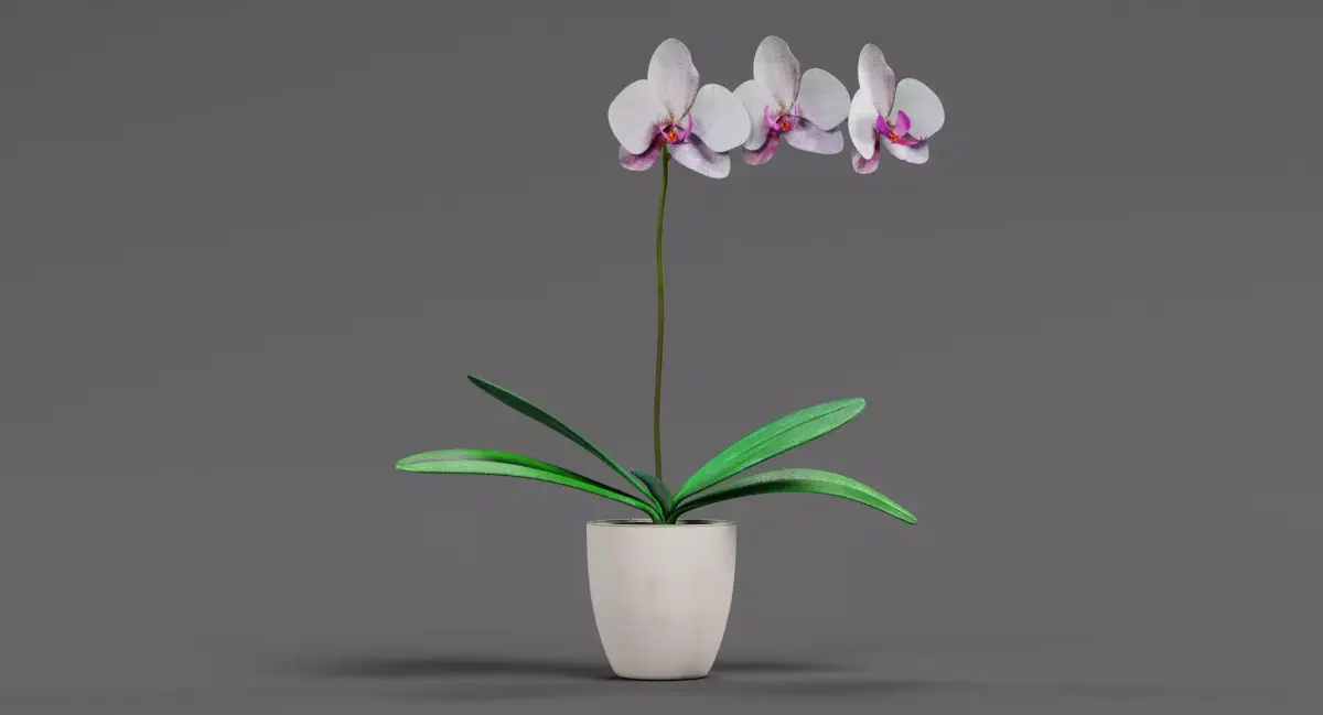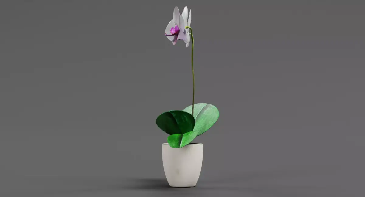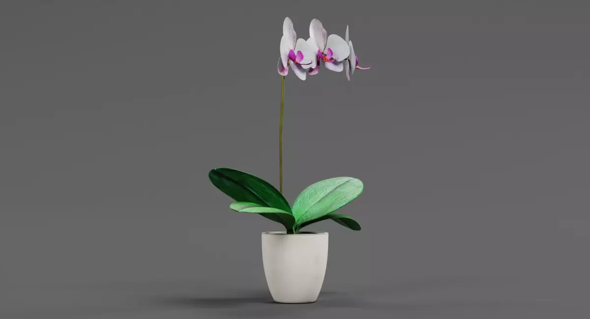 A detailed orchid plant 3D model presented in a neutral cream flower pot. The asset includes a curved stem with multiple blooms and broad leaves forming a balanced, natural composition. Hand-modeled geometry and original textures provide a clean, realistic appearance. The model is ready to use in interior scenes, games, or architectural visualizations without additional setup.