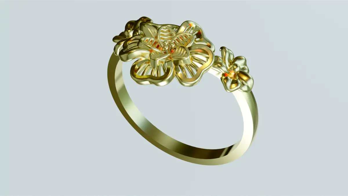 This elegant floral ring features an open-petal blossom design inspired by natural flower forms, combining delicate structure with refined jewelry proportions. Each petal is carefully modeled with smooth curves and clean openwork detailing, creating a light yet luxurious appearance suitable for fine jewelry collections.