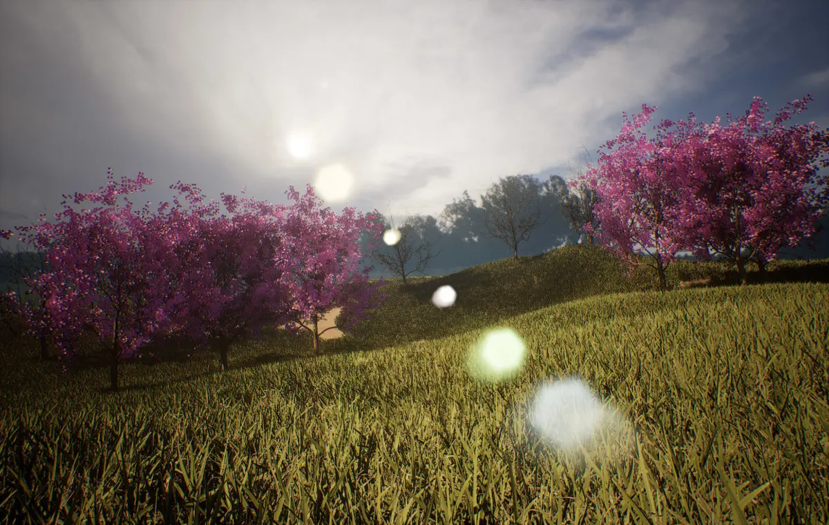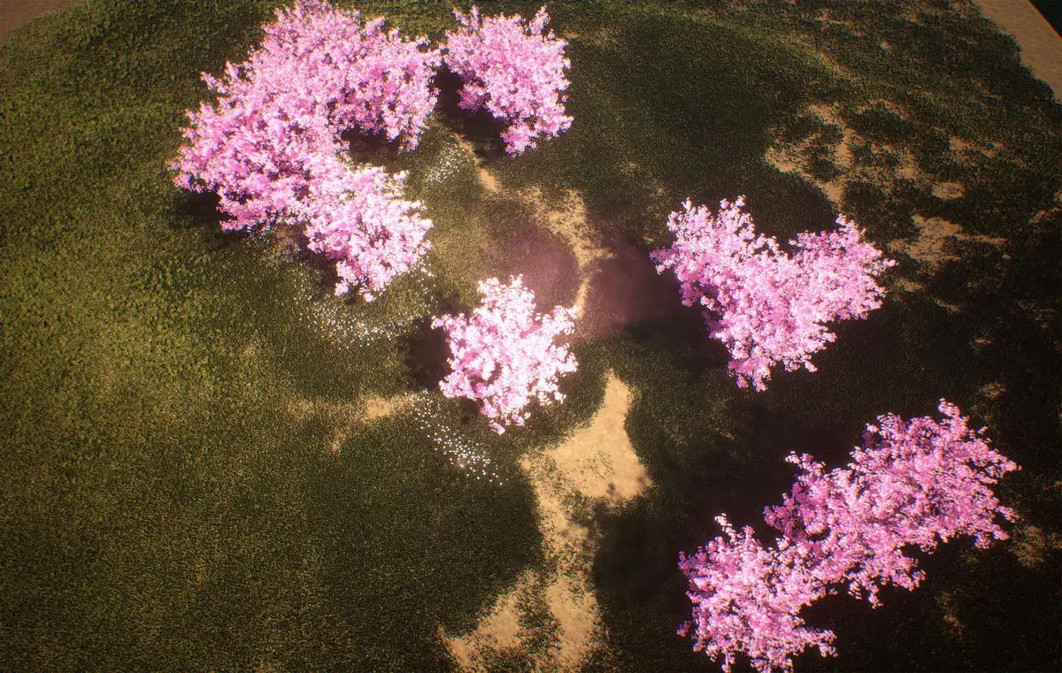 This low poly 3D Scene of a forest of Sikora pink blossom trees, the 3d scene has green meadow landscape with Rolling hill, These are gentle slopes that gradually rise and fall covered with grass.it is a beautiful and detailed addition to any scene. The trees has a realistic shape and size, and the pink flowers are scattered and wind animated throughout the branches, creating a stunning visual effect. The model is also very low poly, making it ideal for use in games and other real-time applications.