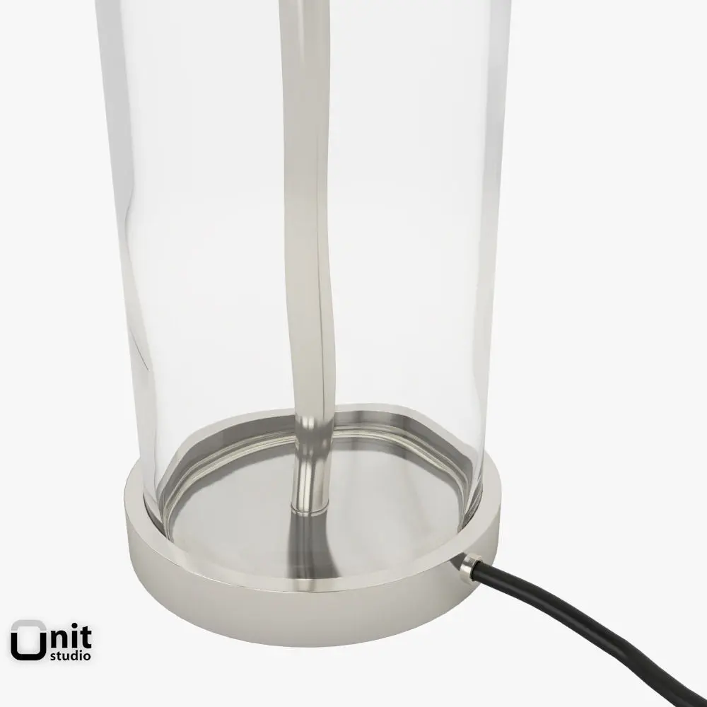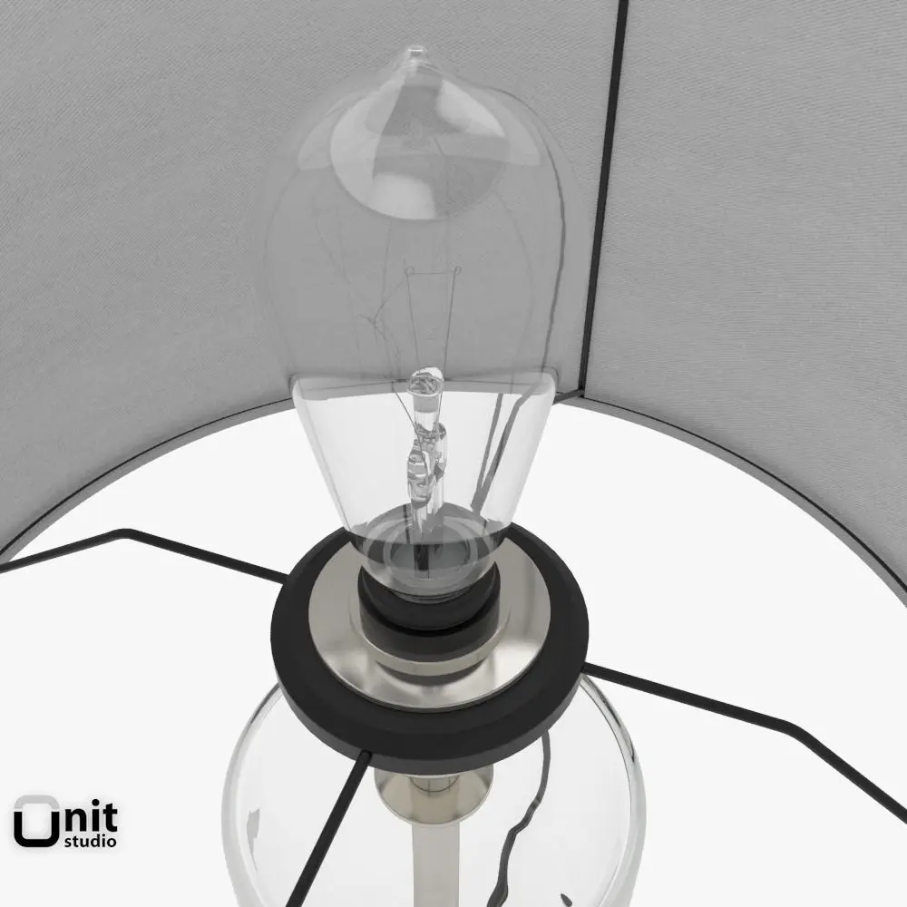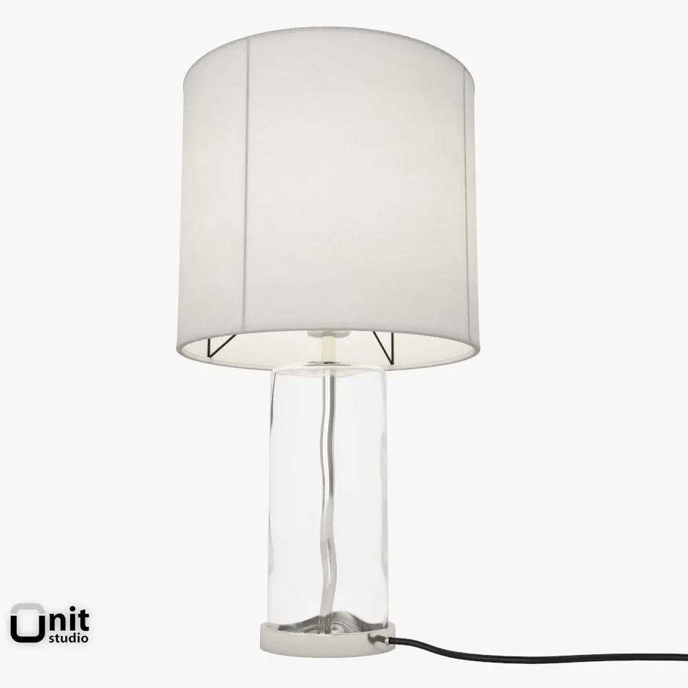 Blown glass is a mid-century style table lamp. It has a characteristic organic shaped blown glass vase which sustains the natural linen for the shade. Distributed by West Elm.