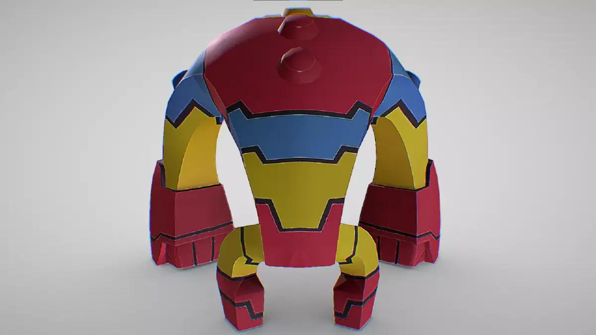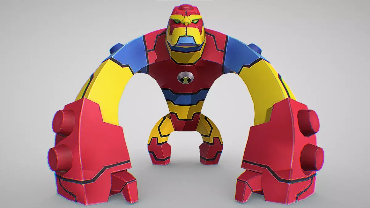 Bloxx's default appearance looks similar to that of a gorilla made of mostly red and yellow building blocks with some blue blocks. He has black lines and studs all over his body. His feet are stubs and his hands are extremely large to balance most of his body. Bloxx wears the Omnitrix symbol on his chest.