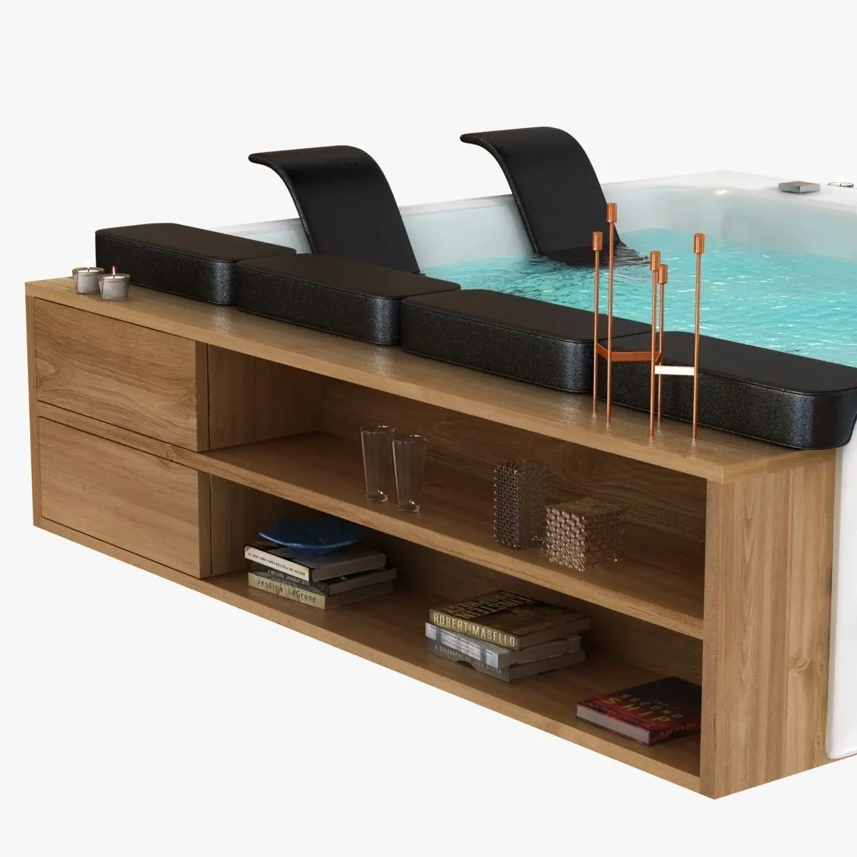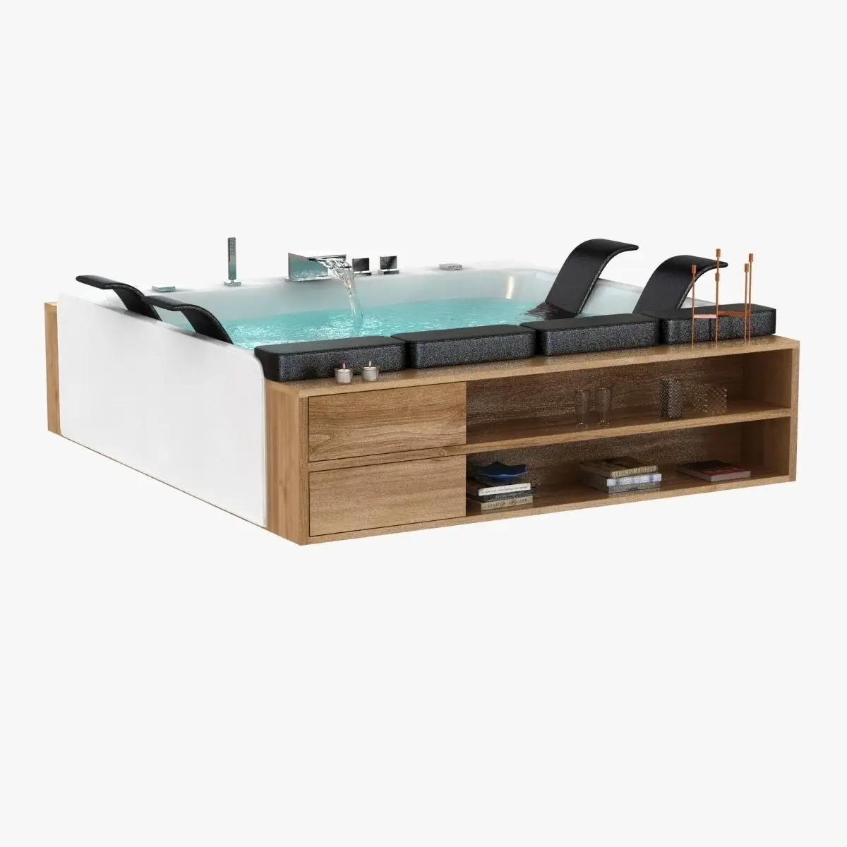 Thais Art is a project that frees creativity, it is like a tailored suit made according to your taste: a new way of conceiving personal space. An incredible universe of sensations and emotions, just waiting to be shared, lowered in the pleasure of the whirlpool massage. The large wooden structure, available in teak or wengé finishes, which covers the acrylic bathtub, offers design and luxury as well as the possibility of exploiting spacious surface and drawers. Thais Art is available with or without whirlpool in Isle, Peninsula and Corner versions and with double digital system BluTwo and BluMix. Accessories: Cromo Relax, tap assembly, Ozone system, Disinfection system, headrests, cushions and double Heater to keep the water temperature unchanged.