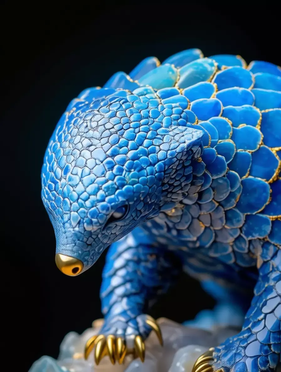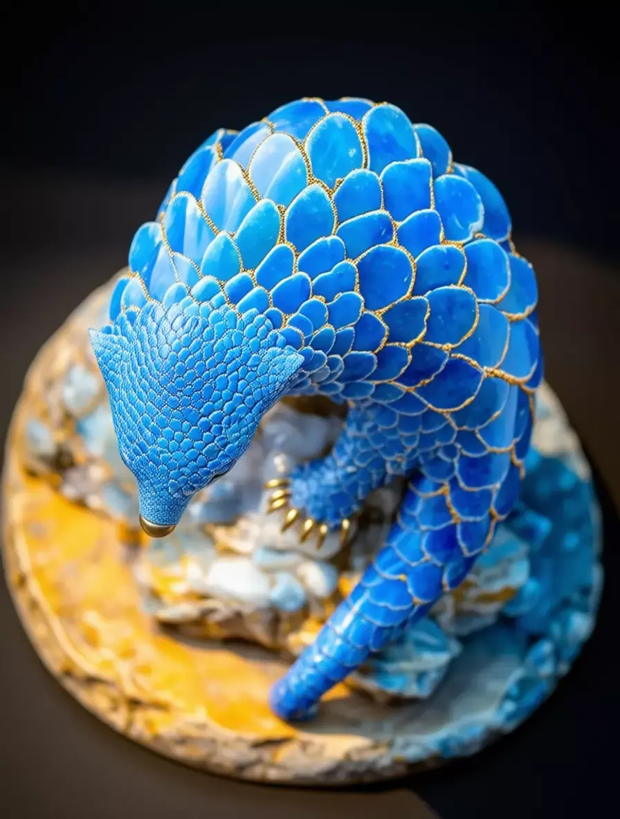 The pangolin’s body is covered in large, overlapping scales, each meticulously detailed with fine textures and subtle imperfections that add realism. The edges of the scales are highlighted with delicate gold veins, mimicking the Japanese art of kintsugi and adding a touch of luxury and spiritual symbolism. Its head is slightly lowered, with small, expressive eyes and a golden snout that enhances its lifelike appearance.