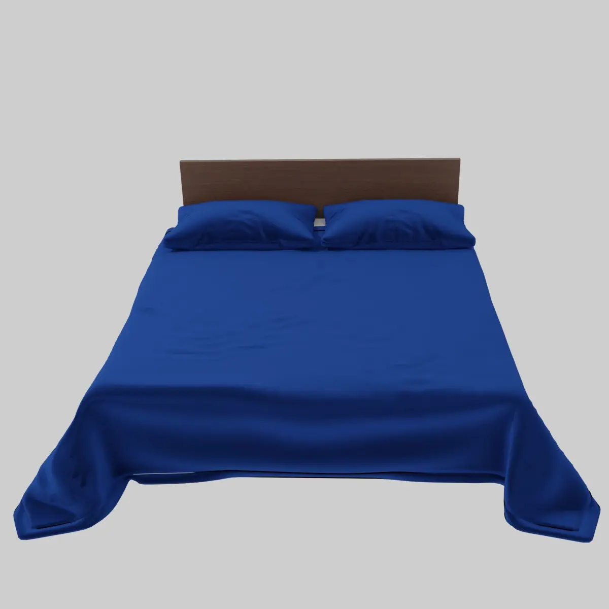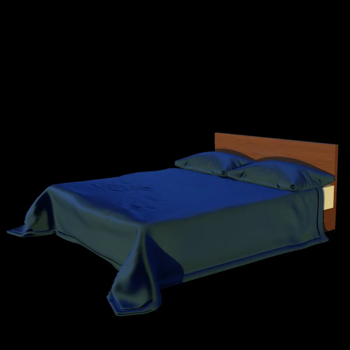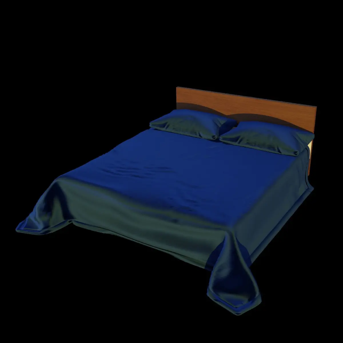 The model is a queen sized bed with a blue, velvet cover and two matching pillows at the head of the bed. The bed includes a brown, rectanguar, wooden headboard. The mattress in the bed is white. There are 6 preview images included. Some of which have a transparent background and/or a sunset HDRI light source. The blanket on the bed has been modified using subdivision surface modifier and so have been the pillows.