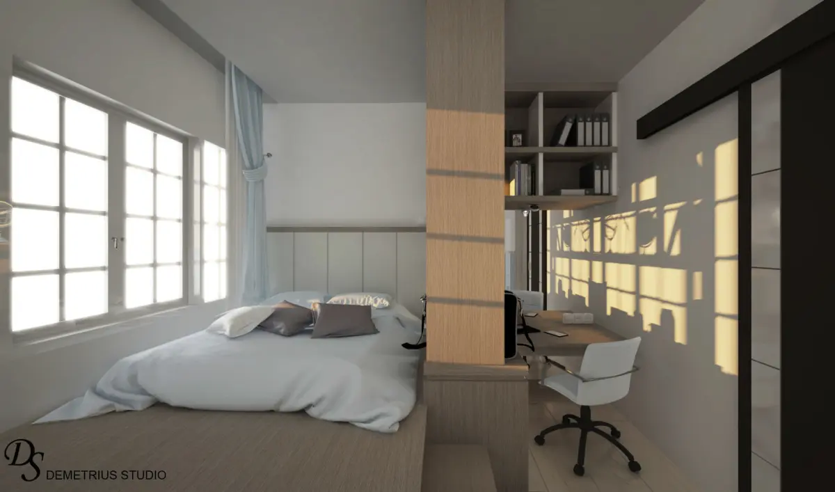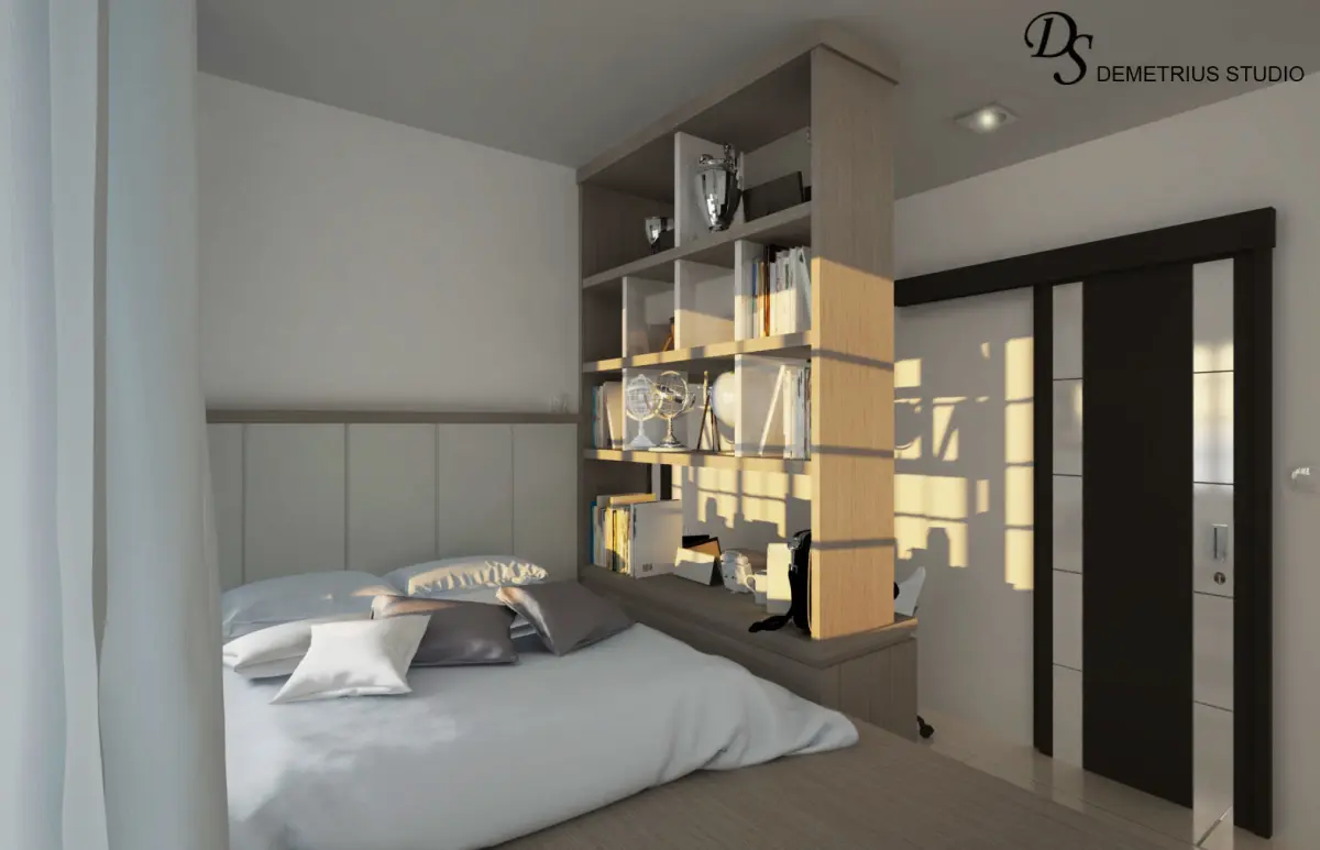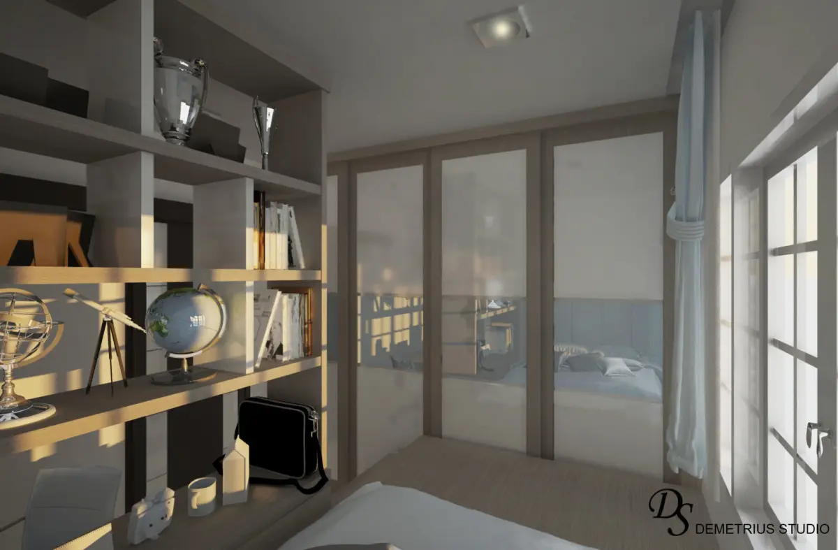 Ready to use small bedroom scene with space saving, built in style bed, slodeing door closet and desk + it's shelve in blue and white color + some wood material