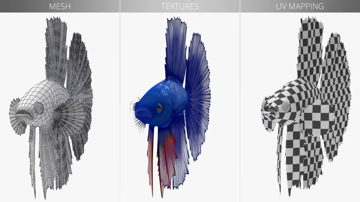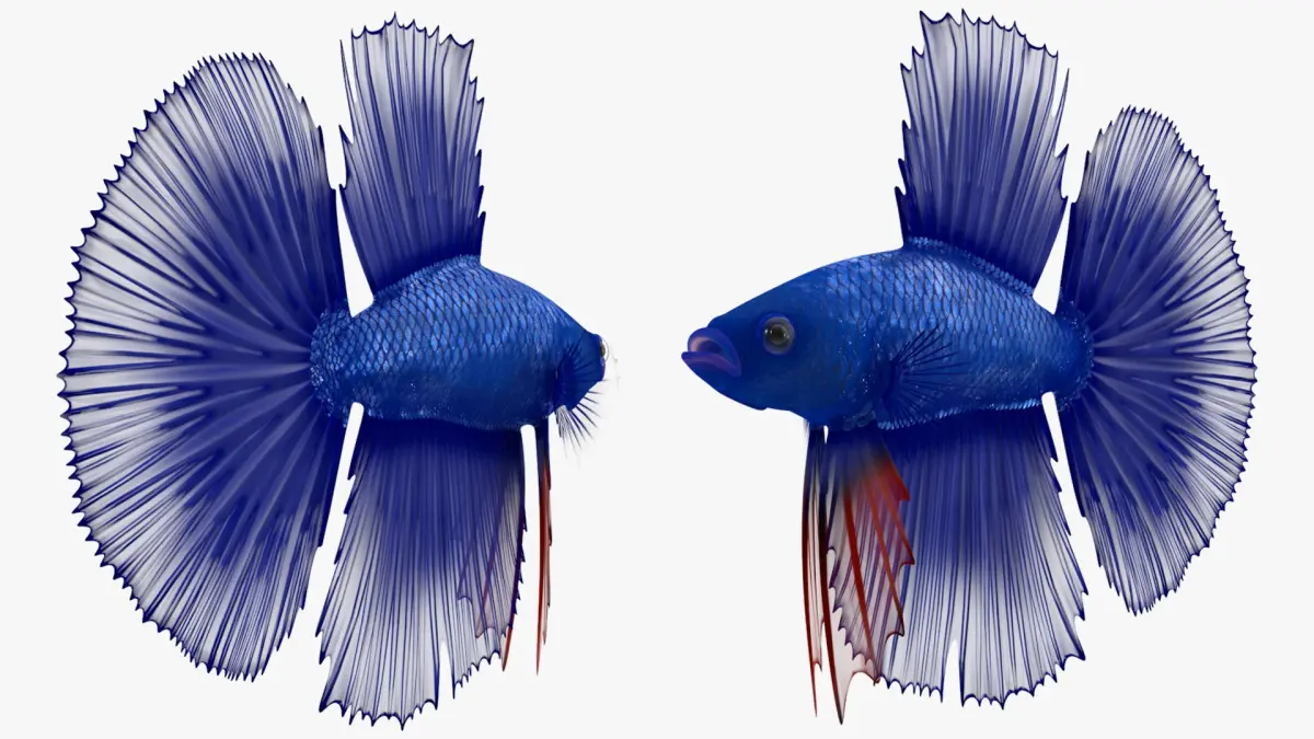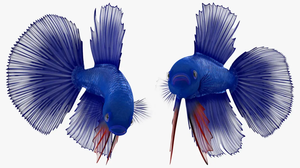 Blue Crowntail Betta Fish Swimming Animated Rigged for Cinema 4D is a three-dimensional model of betta splendens variety, known for its vivid blue color and striking, crown-like tail fin extensions.