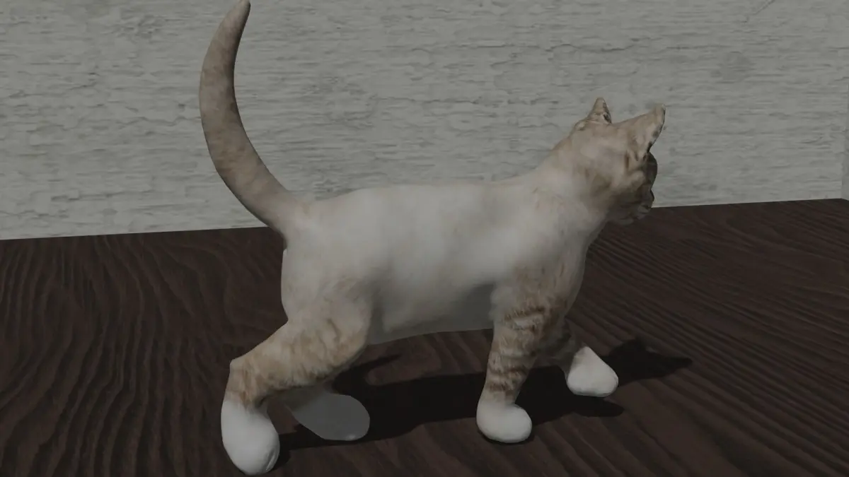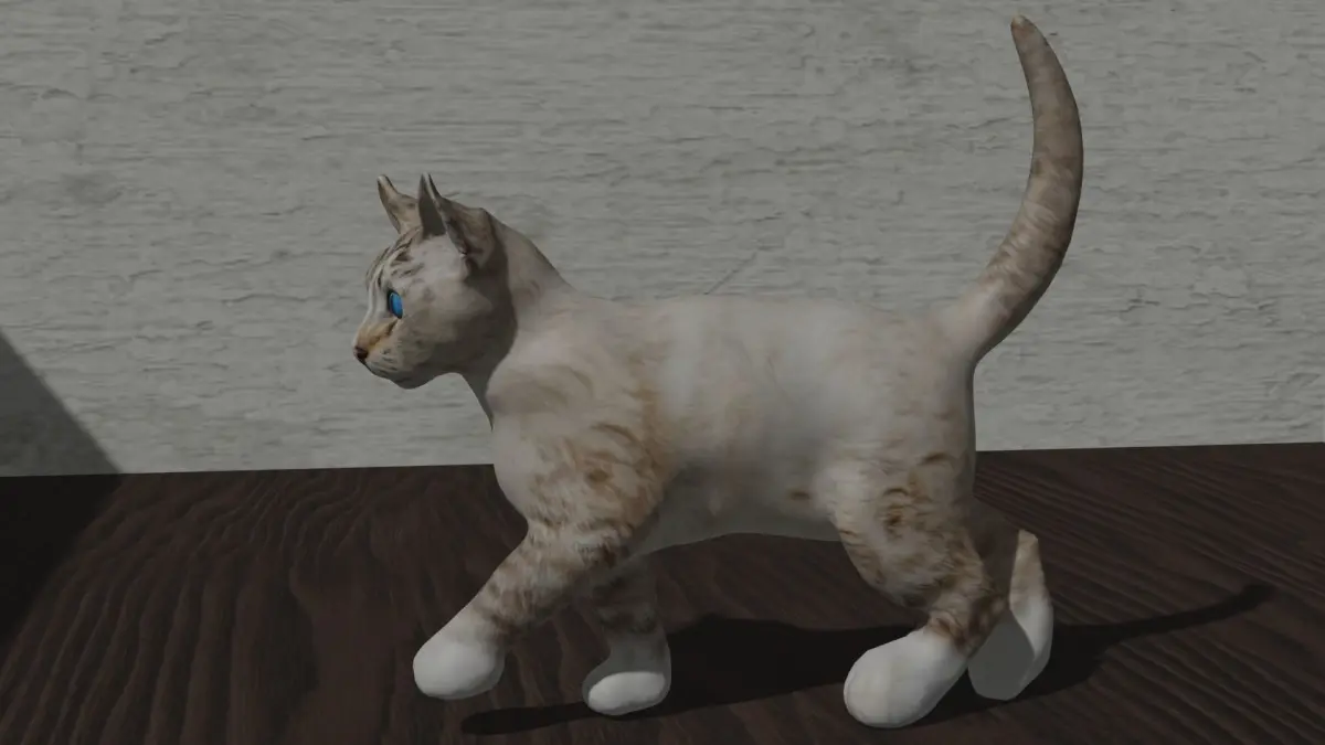 Blue-eyed cat 3D model. The model is low poly with a normal map for details. Texture and materials for the cat, eyes, and surroundings are included. Cat's body is rigged and animated. Some facial expressions are possible, but the mouth is not rigged.