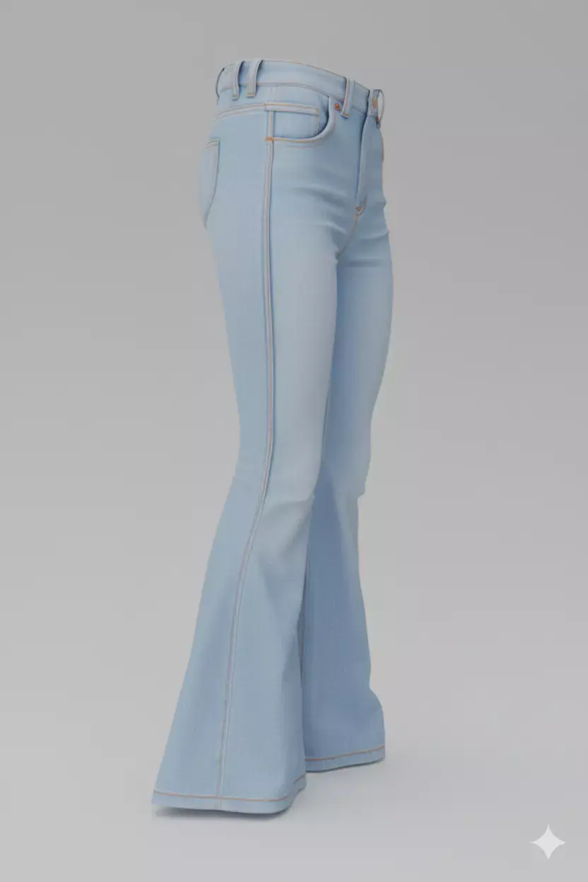 Download the stylish 3D model of blue flared jeans, a digital recreation of a classic, high-waisted denim piece designed to capture the essence of retro fashion and modern tailoring. This flared jeans 3D model features a sleek, fitted silhouette from waist to knee, then flaring out dramatically into wide, bell-bottom legs — creating a bold, dynamic silhouette that exudes confidence and flair. The fabric is rendered in medium-wash blue denim with subtle fading and whiskering effects along the thighs and seat, mimicking real wear and tear for authentic texture. The waistband is detailed with precise stitching, belt loops, a central button, and zipper fly — all modeled with accuracy to reflect real-world construction. Two front pockets are visible with clean topstitching, while the back displays classic yoke seams and welt pockets — enhancing its functional realism. The hem is finished with a neat, double-stitched edge, adding to its polished appearance.