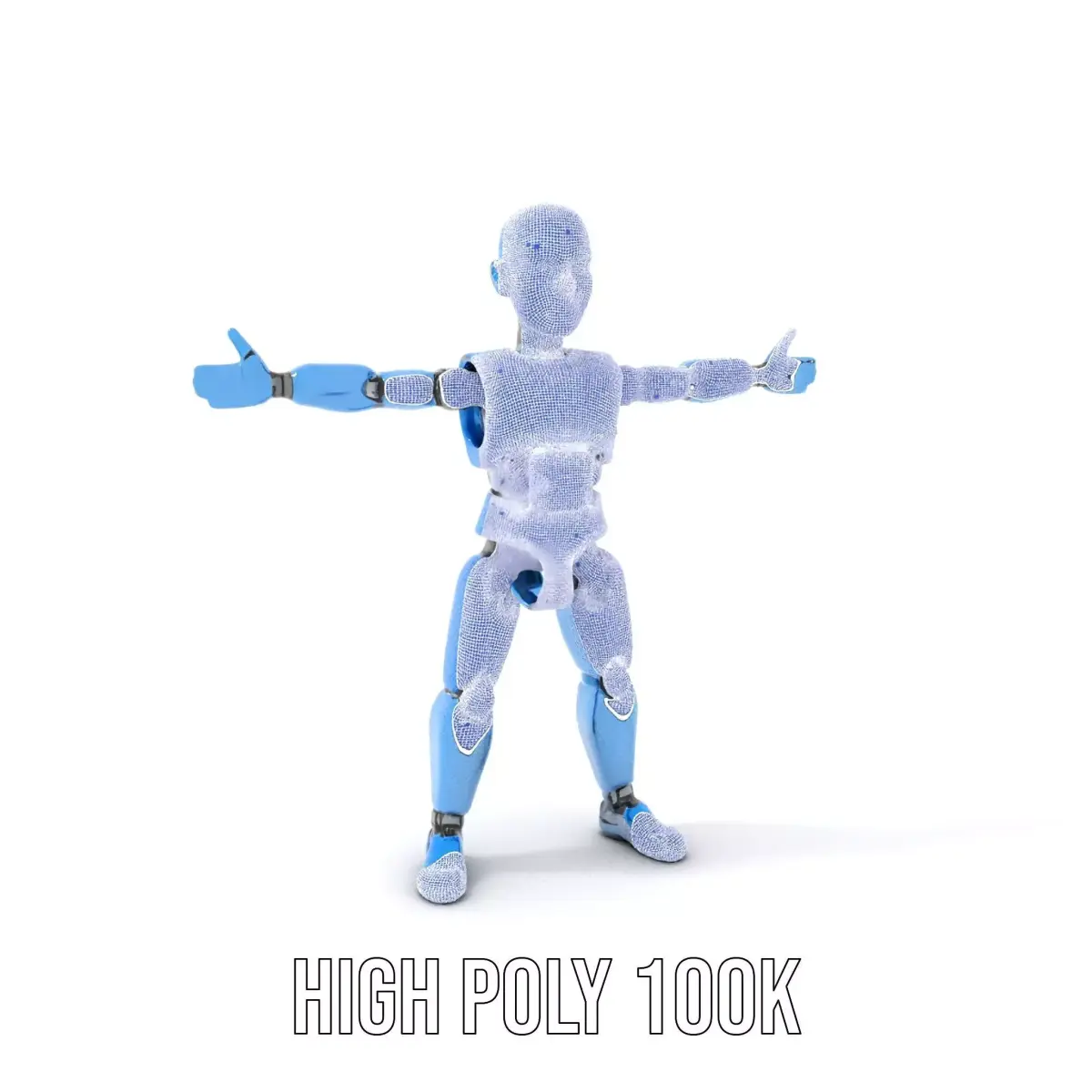 This bright blue futuristic robot model is ideal for use in sci-fi animations, educational programs, and robotics simulations. Each model has 3 levels of detail: low-poly (1000 triangles for mobile), middle-poly (10,000 triangles for environment), and high-poly (100,000 triangles), allowing for use in production rendering in platforms like 3ds Max, Maya, Cinema4D, Blender, Vray/Corona/Cycles, game engines (Unity and Unreal compatible), and interactive presentations. It provides a choice of detail based on the LOD System principle. The robot's sleek design and versatile articulation make it ideal for interactive presentations and educational content, engaging users of all ages. The model's textures are PBR, Diffuse, NormalMap, and reflection/roughness/metallic, suitable for any modern rendering engine. All models are accurately unwrapped with no overlapping UV. All textures are 4096x4096 in size. If you enjoyed this model, please like and leave a comment!