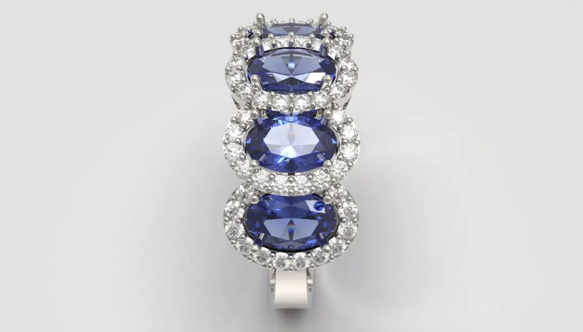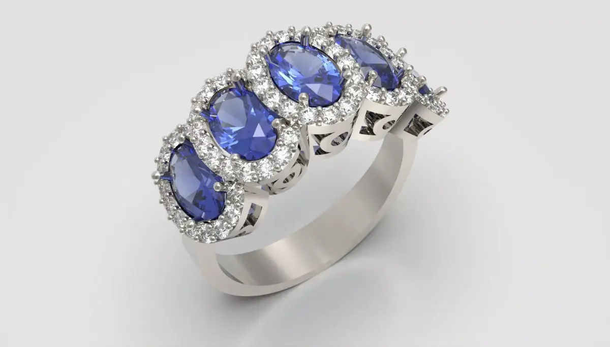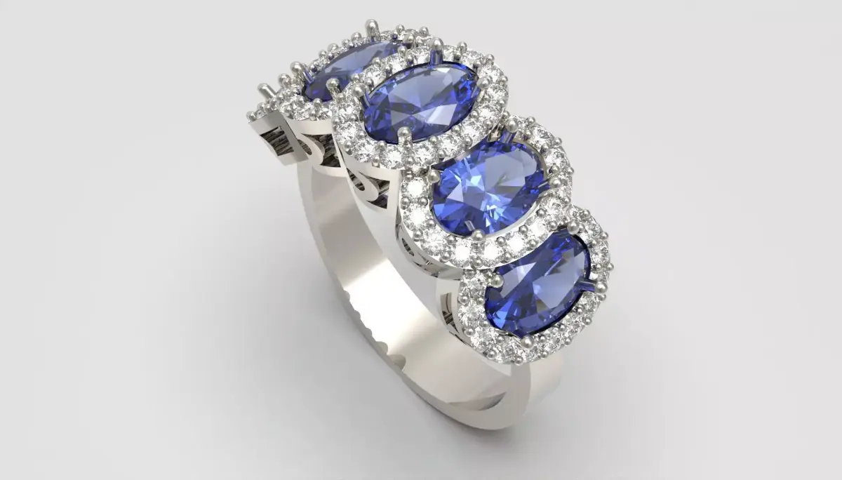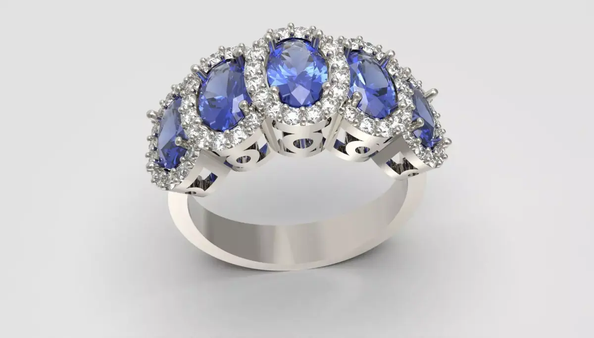 This luxurious ring showcases five captivating oval sapphires arranged in a graceful flowing line, each radiating a deep blue brilliance that instantly draws the eye.Surrounding every sapphire is a finely crafted halo of round brilliant diamonds, enhancing contrast and creating a luminous crown-like sparkle.The elevated prong settings allow light to dance through every facet, giving the piece a vibrant, shifting glow from every angle.Sculpted metalwork, smooth contours, and balanced proportions complete the design, resulting in a visually stunning statement ring that blends elegance, refinement, and high-end ornamental beauty for close-up renders and premium jewelry presentations.Ring size: 54 EuroFor any edit or revision: +447301387795 or elpouriapaypal@gmail.com
