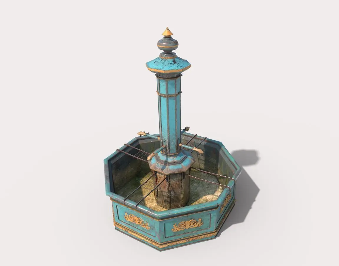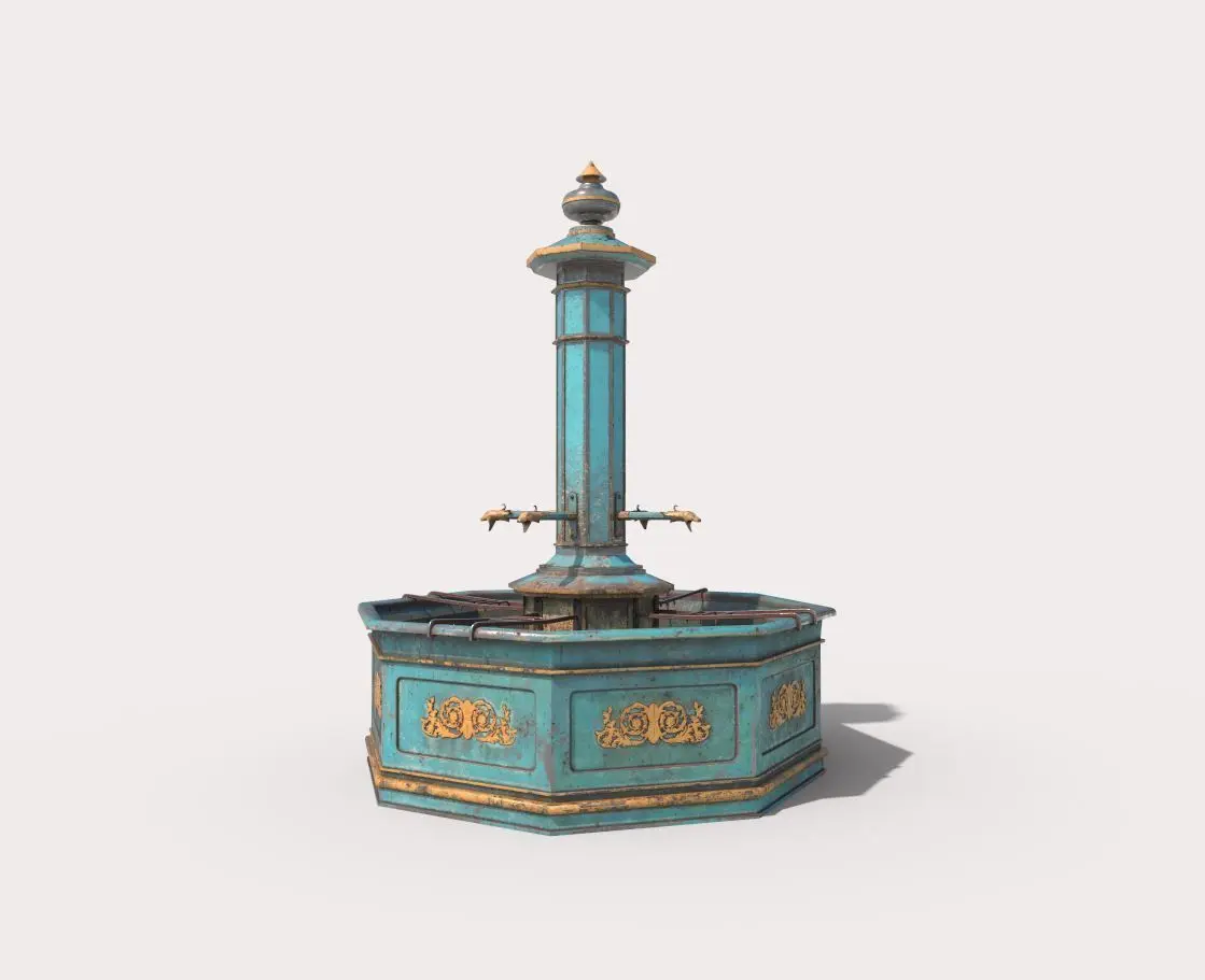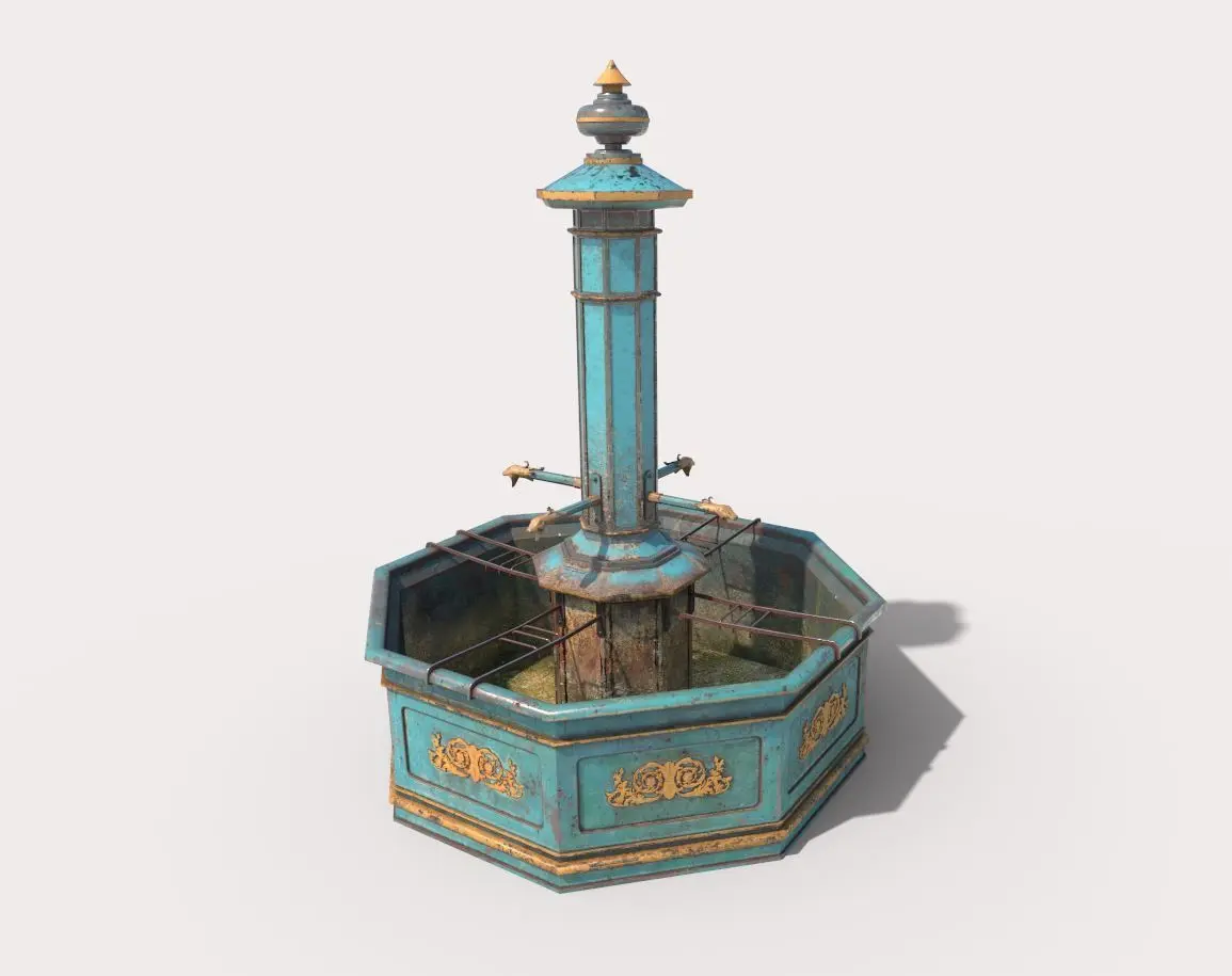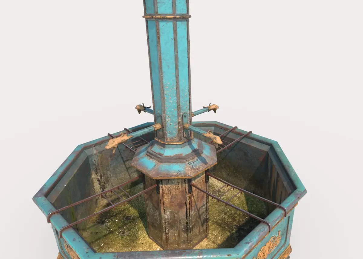 Model of blue metal fountain . Model is very realistic. It has 4 PBR material.Maps are diffuse-specular-glossiness-height and normal. Also, PBR Metallic-Roughness ( Basecolor- Metallic- Normal-Roughness- Height ) workflow has been added. Model's textures has two sizes; 4096x4096-2048x2048. All maps are PNG formats .
