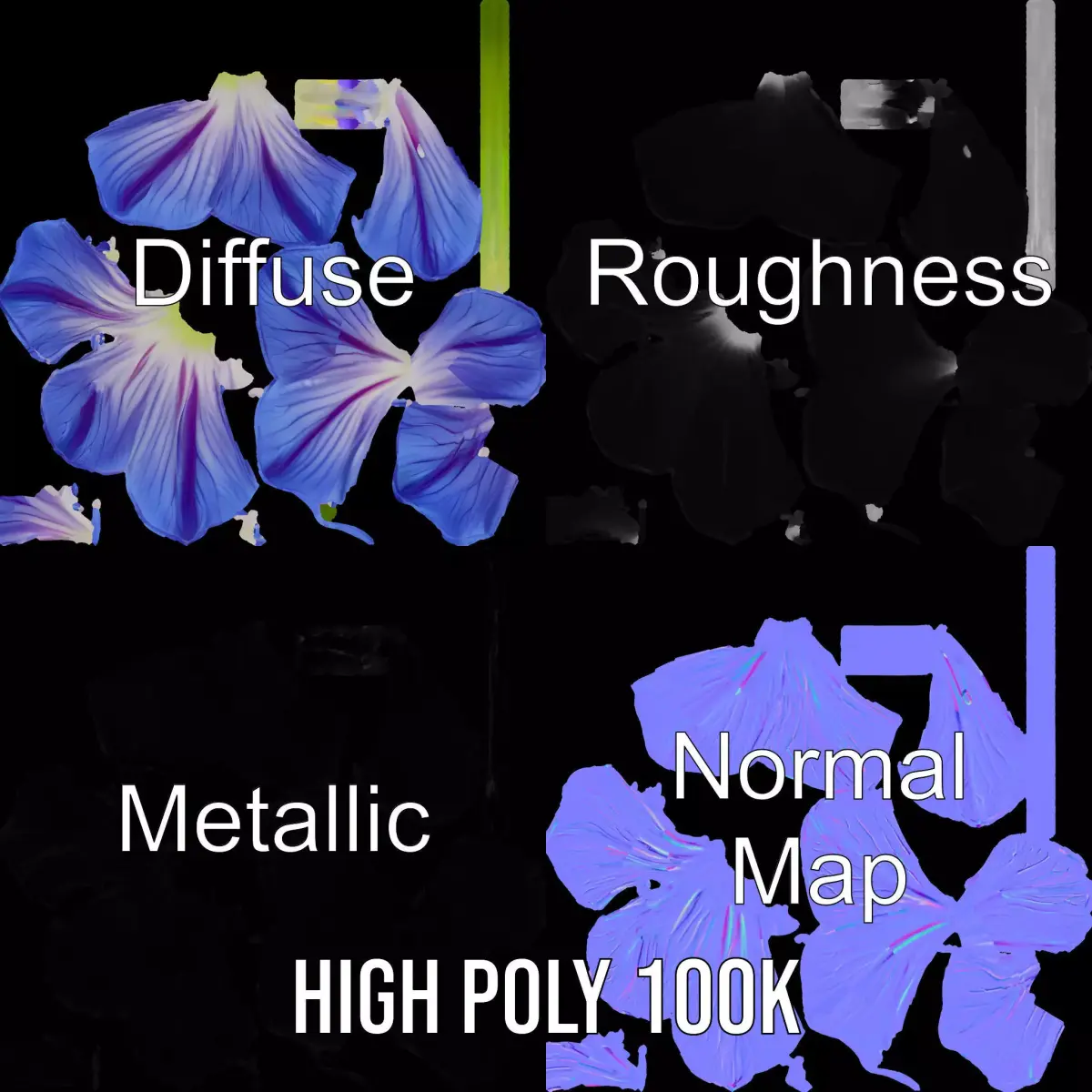 This exquisite Blue Morning Glory model pack captures the delicate beauty of the morning glory flower, featuring a vibrant blue hue and intricate petal details. Ideal for nature scenes, educational tools, or artistic projects, the model offers versatility and realism. Each model has 3 levels of detail: low-poly (1000 triangles for mobile), middle-poly (10,000 triangles for environment), and high-poly (100,000 triangles), which allows for the use of this model in production rendering (such as 3ds Max, Maya, Cinema 4D, Blender, Vray/Corona/Cycles and all others), game engines (Unity and Unreal compatible), and interactive presentations, providing a choice of detail based on the LOD System principle. The model's textures are PBR, Diffuse, NormalMap, and reflection/roughness/metallic, which are suitable for any modern rendering engine. All models are accurately unwrapped and have no overlapping UVs. All textures are 4096*4096 in size. If you like this model, please like and leave a comment.