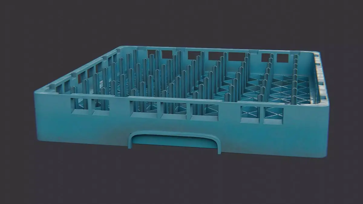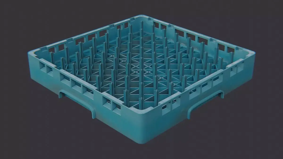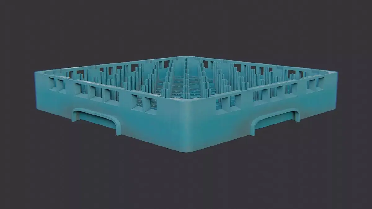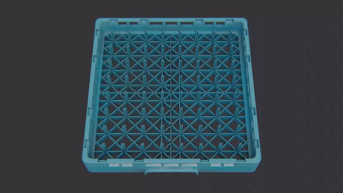 Blue plastic dish rack designed for bar and kitchen use. It features a ventilated grid base and sturdy walls to separate cups, plates and utensils. This compact rack is lightweight, easy to clean, and fits countertops in cafes, restaurants or homes. Ideal for organizing dishware while drying, it adds practical color to any counter.