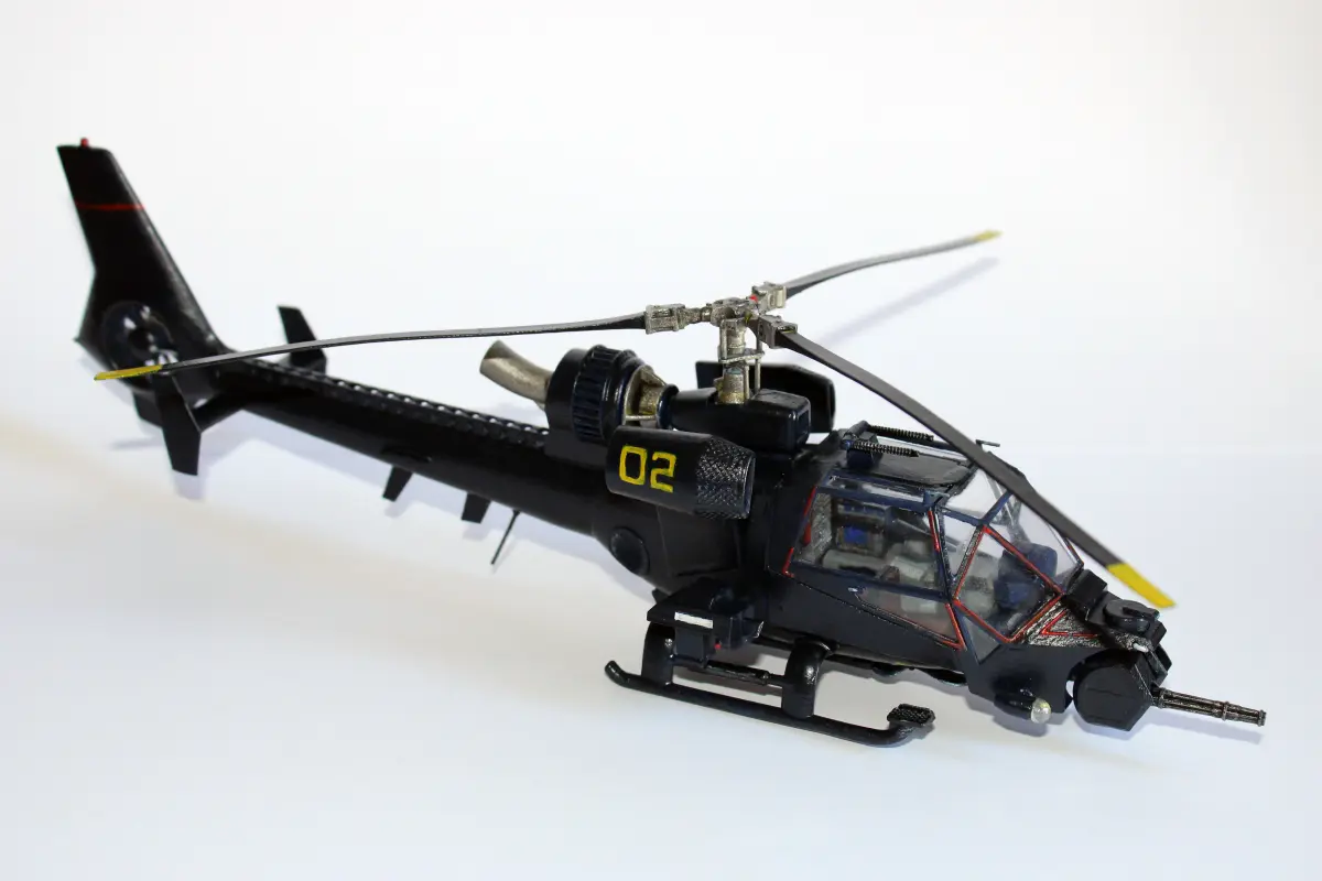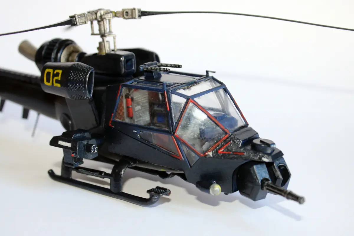 Designer Mickey Michaels created the helicopters used in the film after reviewing and rejecting various existing designs. The helicopters used for Blue Thunder were French built Aérospatiale SA-341G Gazelles modified with bolt-on parts and Apache-style canopies. Two modified Gazelle helicopters, a Hughes 500 helicopter, and two radio-controlled F-16 fighter models were used in the filming of the movie. The helicopters were purchased from Aérospatiale by Columbia Pictures for $190,000 each and flown to Cinema Air in Carlsbad, California where they were heavily modified for the film. These alterations made the helicopters so heavy that various tricks had to be employed to make it look fast and agile in the film. For instance, the 360° loop maneuver Murphy performs at the end of the film, which catches Cochrane so completely by surprise that he is easily shot down by Murphy's gunfire and killed, was carried out by a radio controlled model.