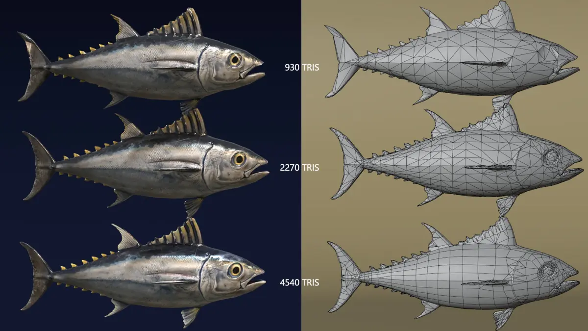 Bluefin Tuna Fish low poly model. Great choice for realtime graphics as a hero or a background asset. The archive contains three versions of the model of 930, 2270 or 4540 polygons depending on how detailed you need it.