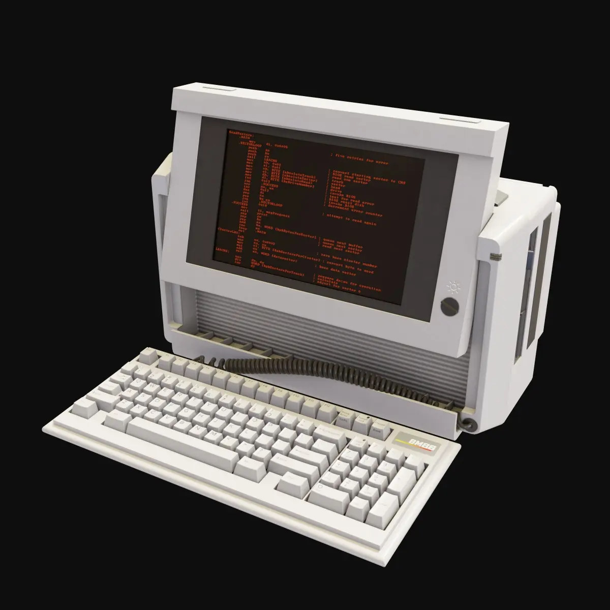 Retro portable PC with single color flat screen plasma display. Included are 4k PBR textures in PNG format and an illustrator file to make editing the keys/screen/logo very simple. Textures included: