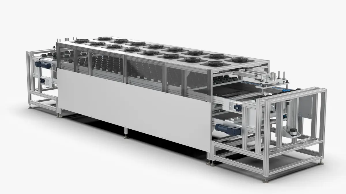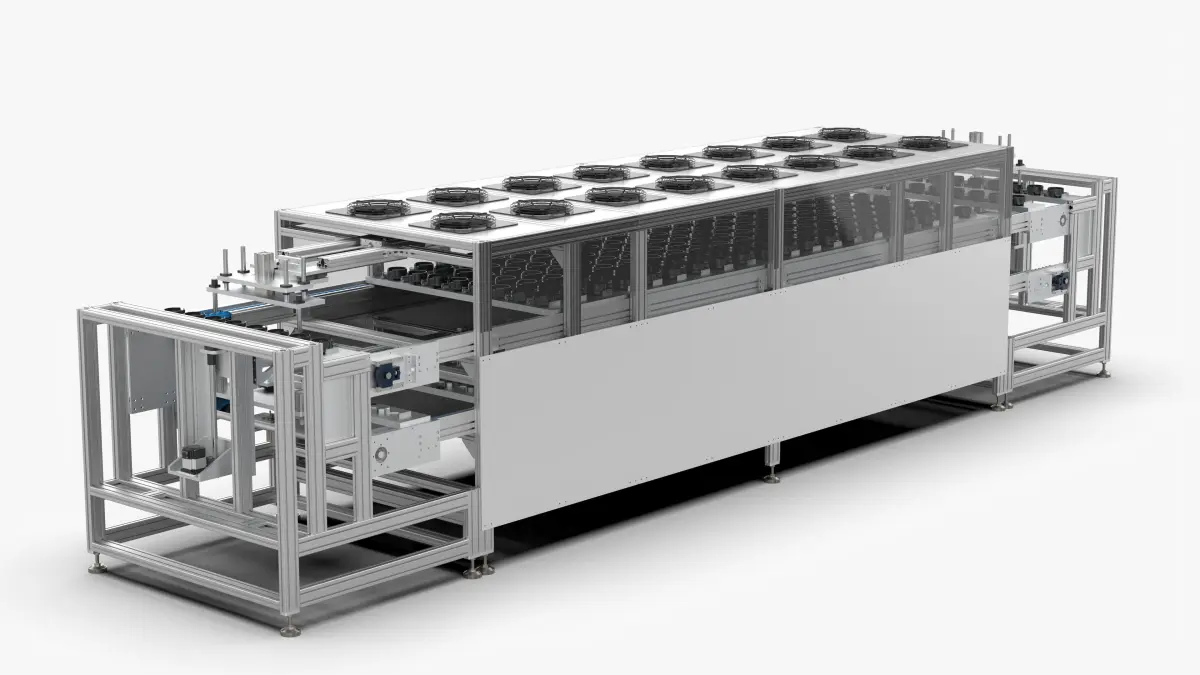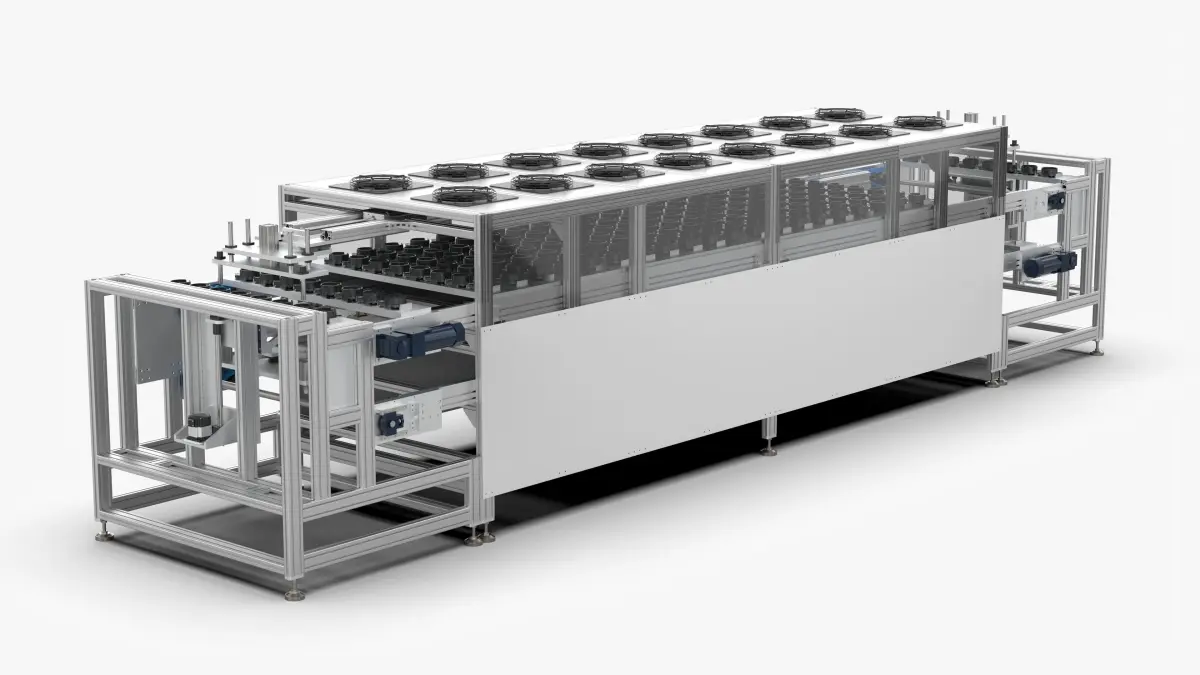 This set of models is a BMC plastic-encapsulated stator cooling line. The line body is used in the plastic-encapsulation workshop of the motor manufacturer. The temperature of the stator after being injected by BMC is as high as 120°C. At this time, the temperature of the motor body is not conducive to the subsequent stator performance testing, and the natural air cooling speed is slow. Production efficiency and cause a large accumulation between the front and back. Therefore, rapid cooling is required through external conditions. Axial flow fan is used to accelerate the cooling of the stator, the line body adopts double-layer 2.5 times speed chain, and the upper and lower mechanisms of the front and rear head adopt the structure of stepping motor and ball screw.