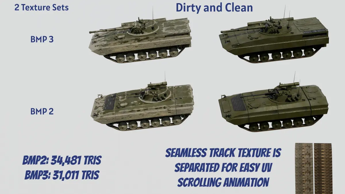 Individual tris count:BMP 2 - 31,481 trisBMP 3 - 31,011 tris
