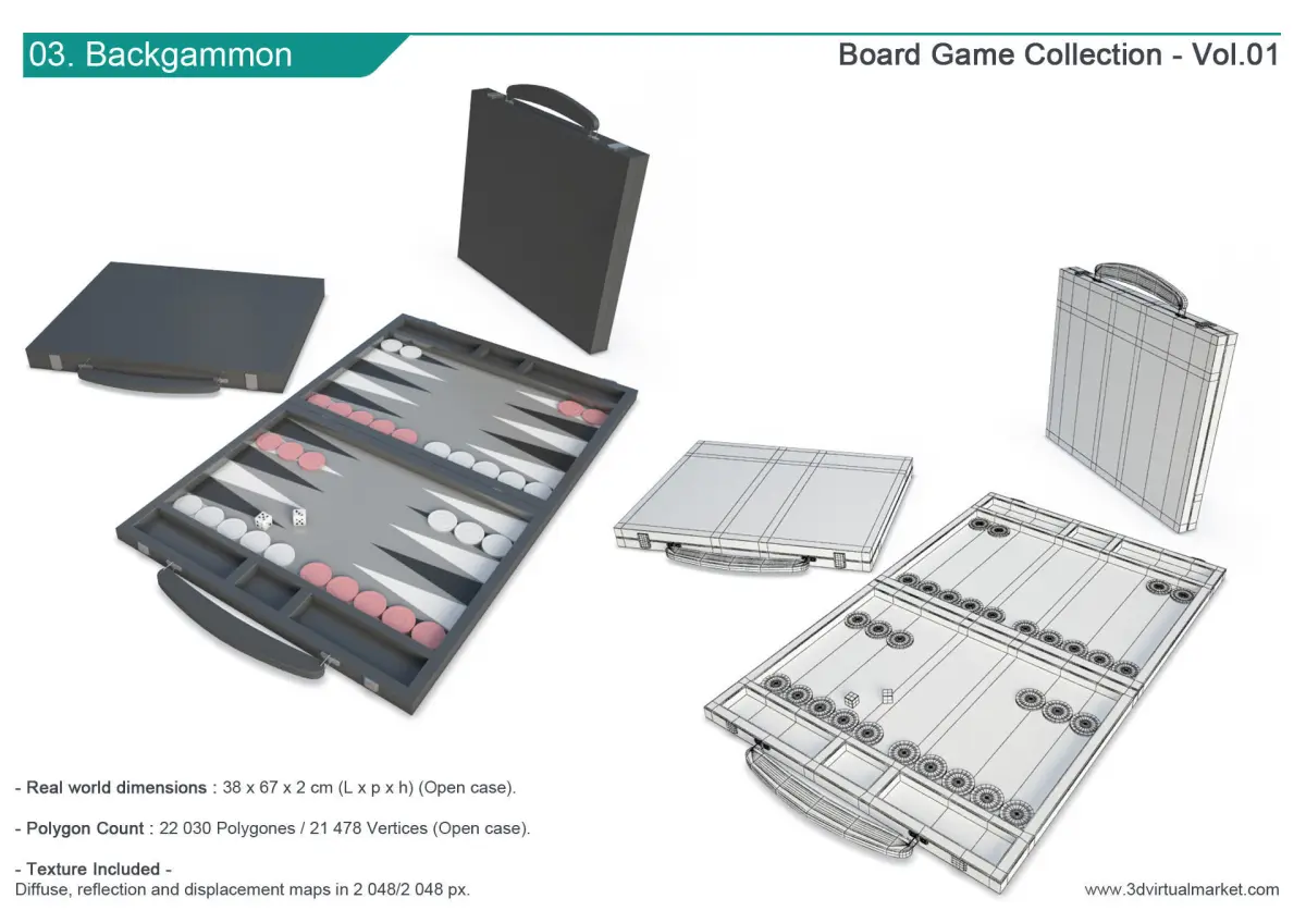 3/. Backgammon: L.38 x H.2 x P.67 cms. 22 030 polygons / 21 478 vertices.