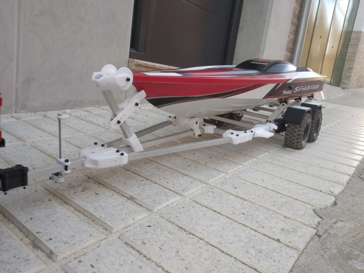 Boat trailer, customizable in length and width. For its construction you need 3 metric screws and 10x10mm square aluminum rod is recommended. You can also buy crawler wheels from 90 to 110mm. It has independent suspension on each wheel increasing the realism of the trailer. It has a manual winch with which you can hold the boat and introduce it directly into the water.It can be printed on any 3D printer, using PLA, in the orientations shown in the images.